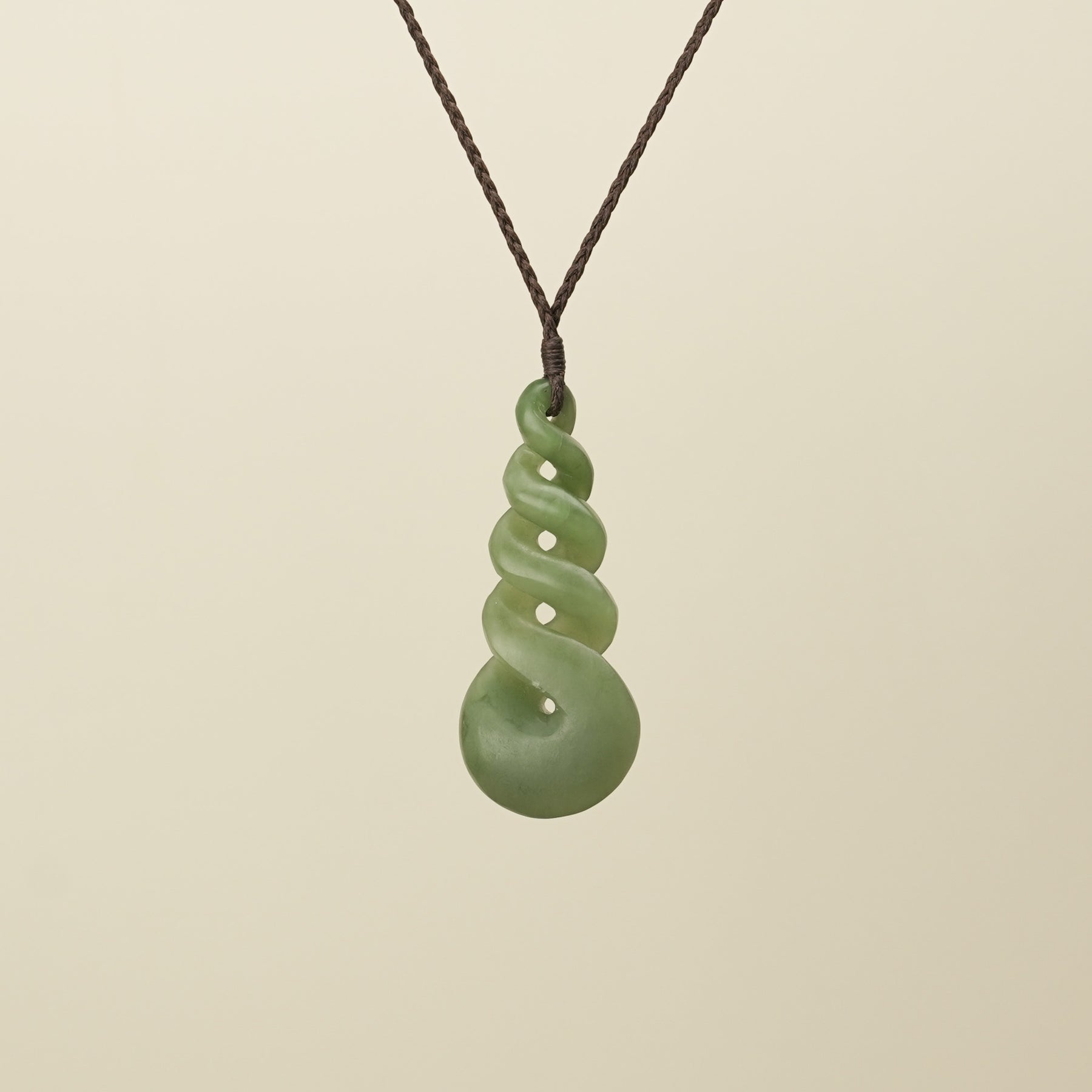 Symbolising the intertwining of lives, this large quadruple twist pendant is carved from New Zealand greenstone with light kahurangi tones. It represents the enduring connections between whānau, groups, or two individuals, embodying the lasting bonds of friendship, love, and shared experiences. The pendant comes with a brown hand-bound and woven adjustable cord. It is presented in an eco-friendly box with cards explaining its meaning and care instructions.