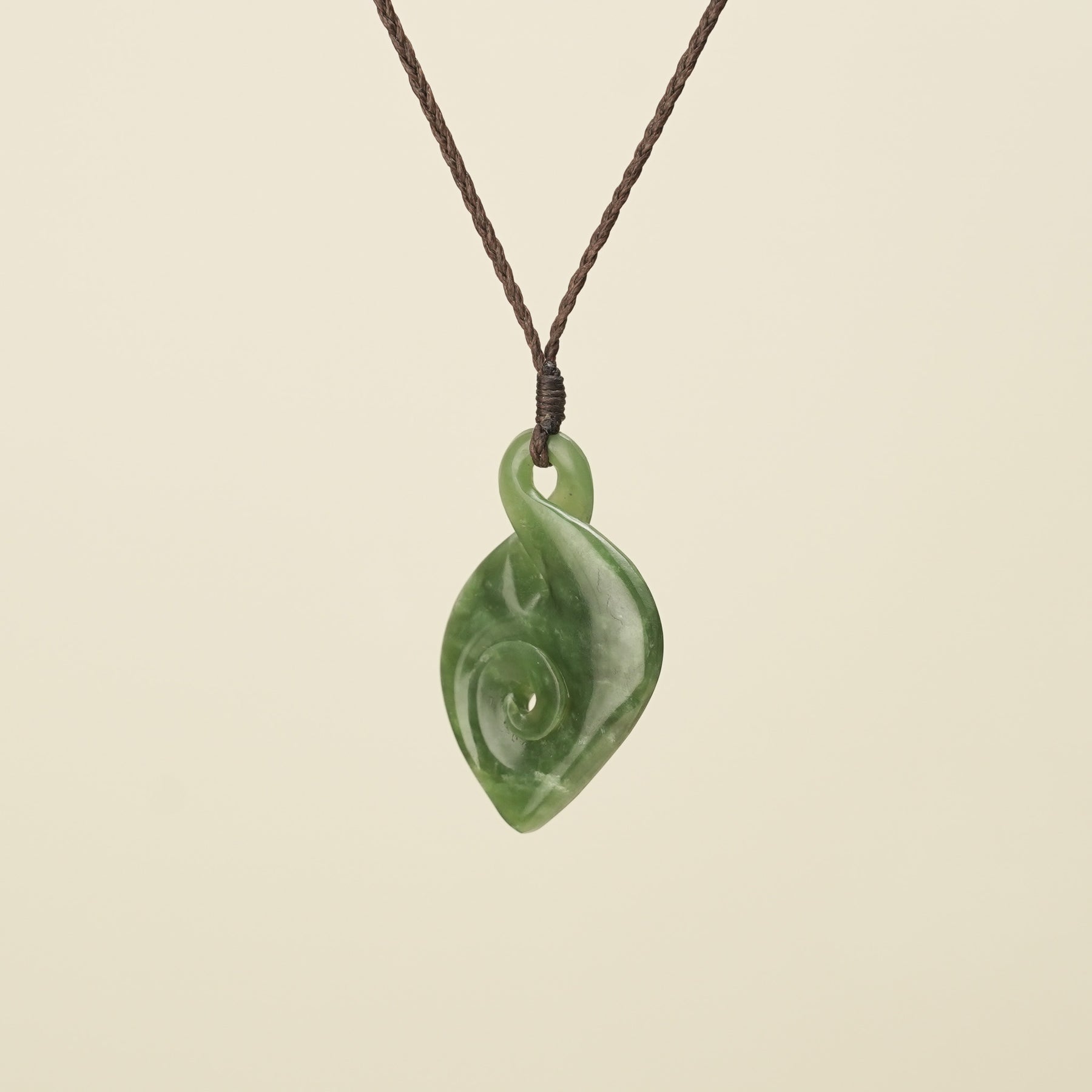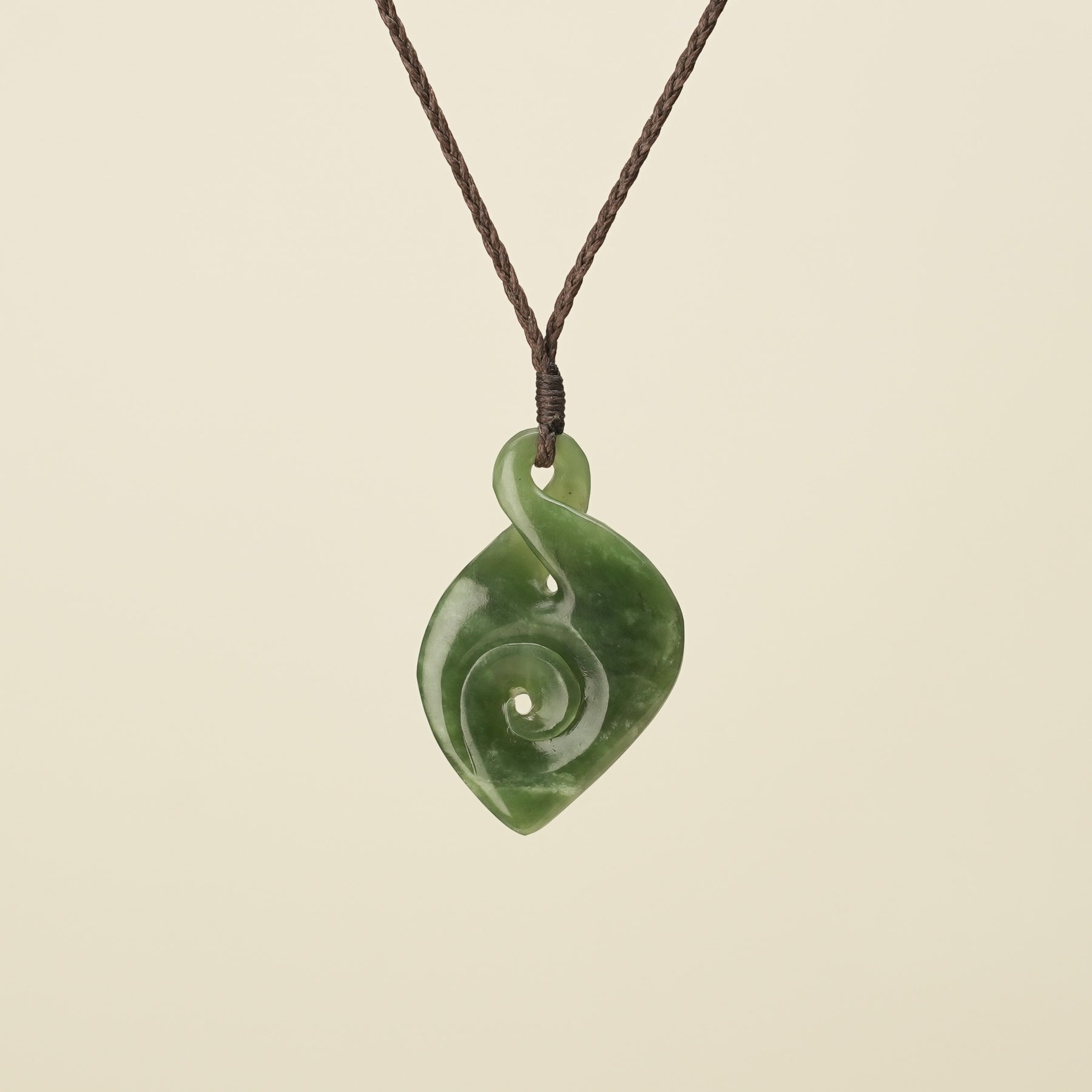 Carved from New Zealand Kahurangi greenstone, known for its light, calm green hue, this pendant combines the Pikorua and Koru designs in a beautifully intertwined form. The gentle tones of Kahurangi reflect clarity and purity, enhancing the stone's natural beauty. The twist and koru patterns symbolise deep connections, capturing the essence of friendship, whānau, new beginnings, and aroha. This piece comes with a handwoven brown wax cord and is presented in an eco-friendly box, accompanied by meaning cards that detail its cultural significance and care instructions.
