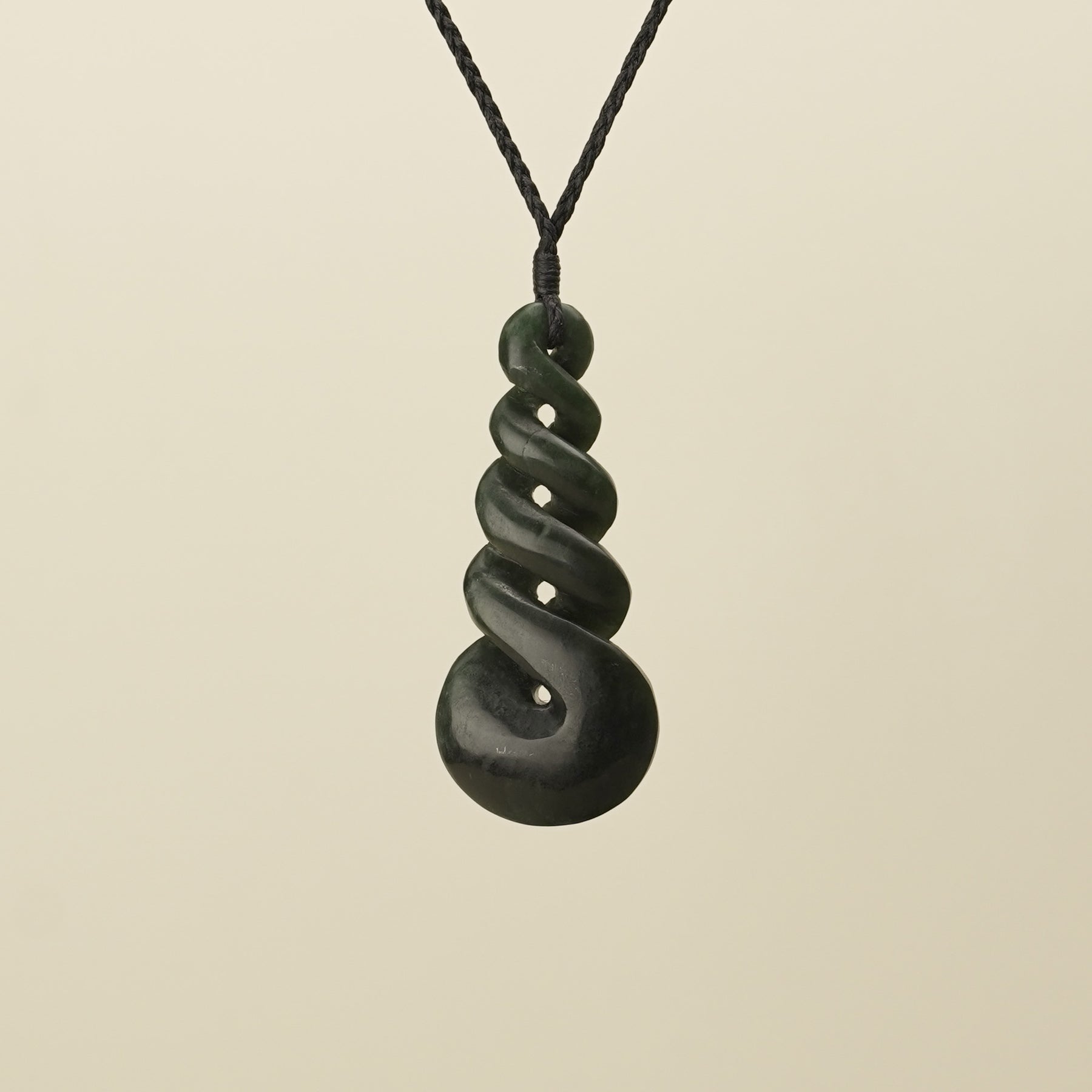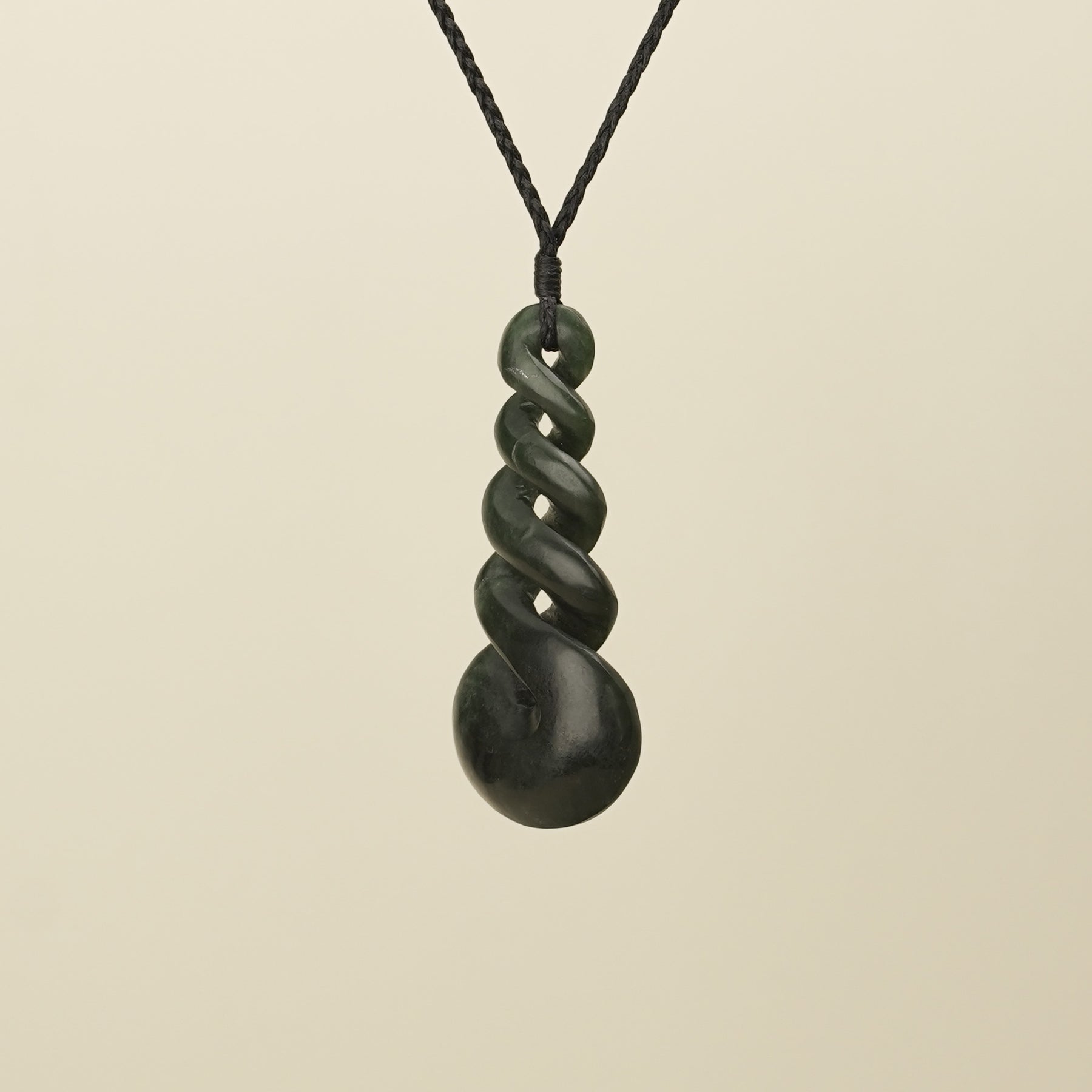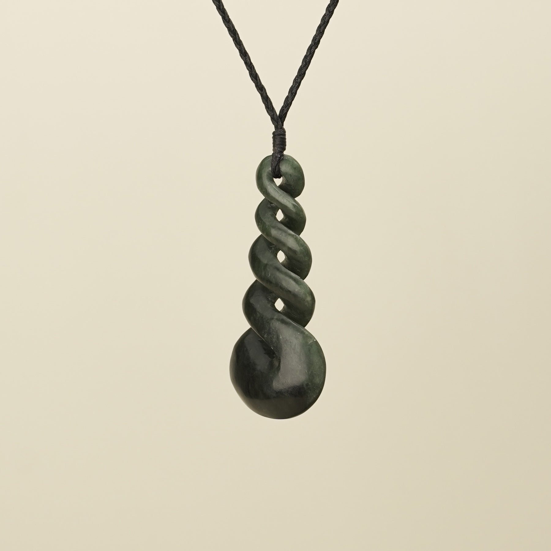 Symbolising the intertwining of lives, this large quadruple twist pendant is carved from New Zealand greenstone with dark kawakawa tones. It represents the enduring connections between whānau, groups, or more than two individuals, embodying the lasting bonds of friendship, love, and shared experiences. The pendant comes with a black hand-bound and woven adjustable cord. It is presented in an eco-friendly box with cards explaining its meaning and care instructions.
