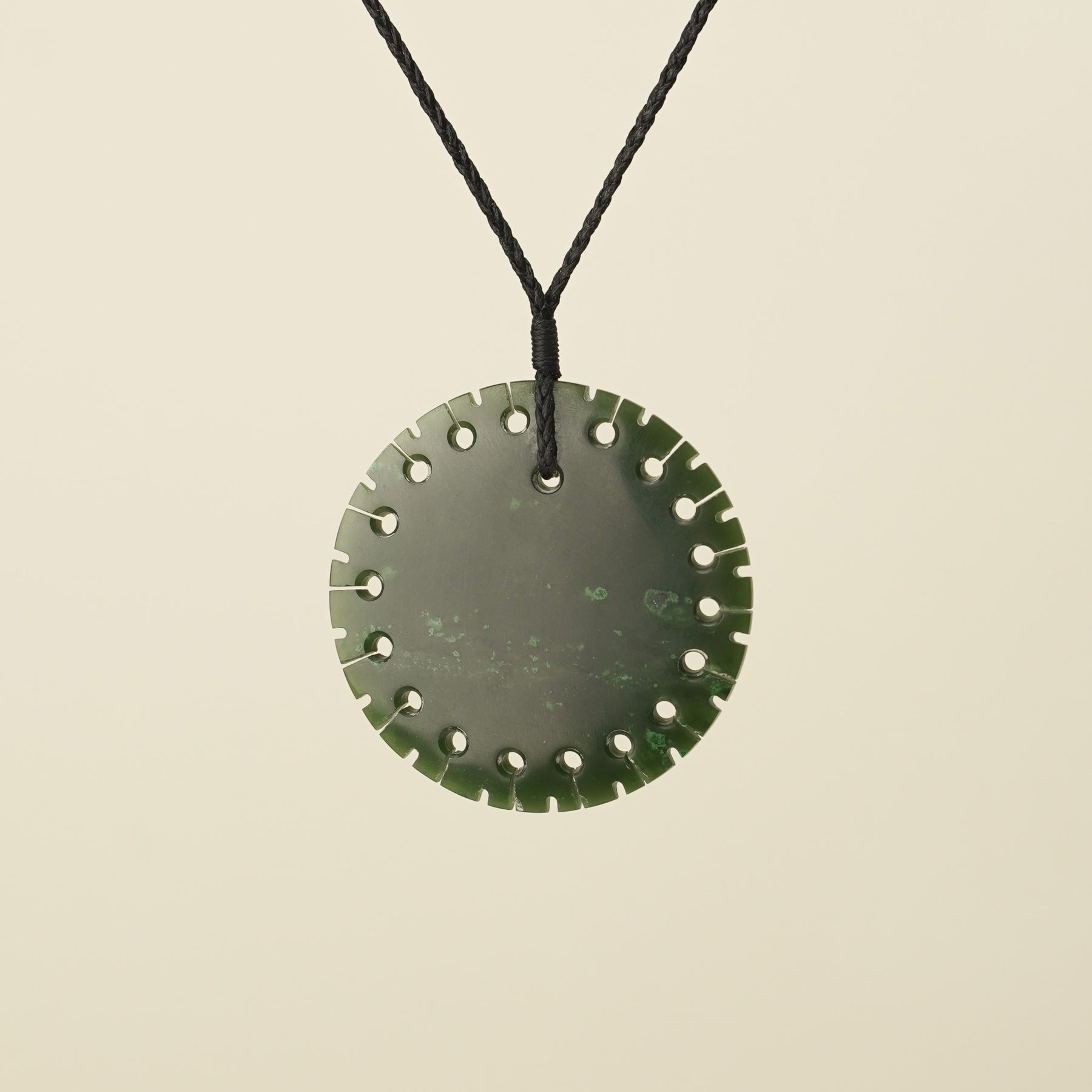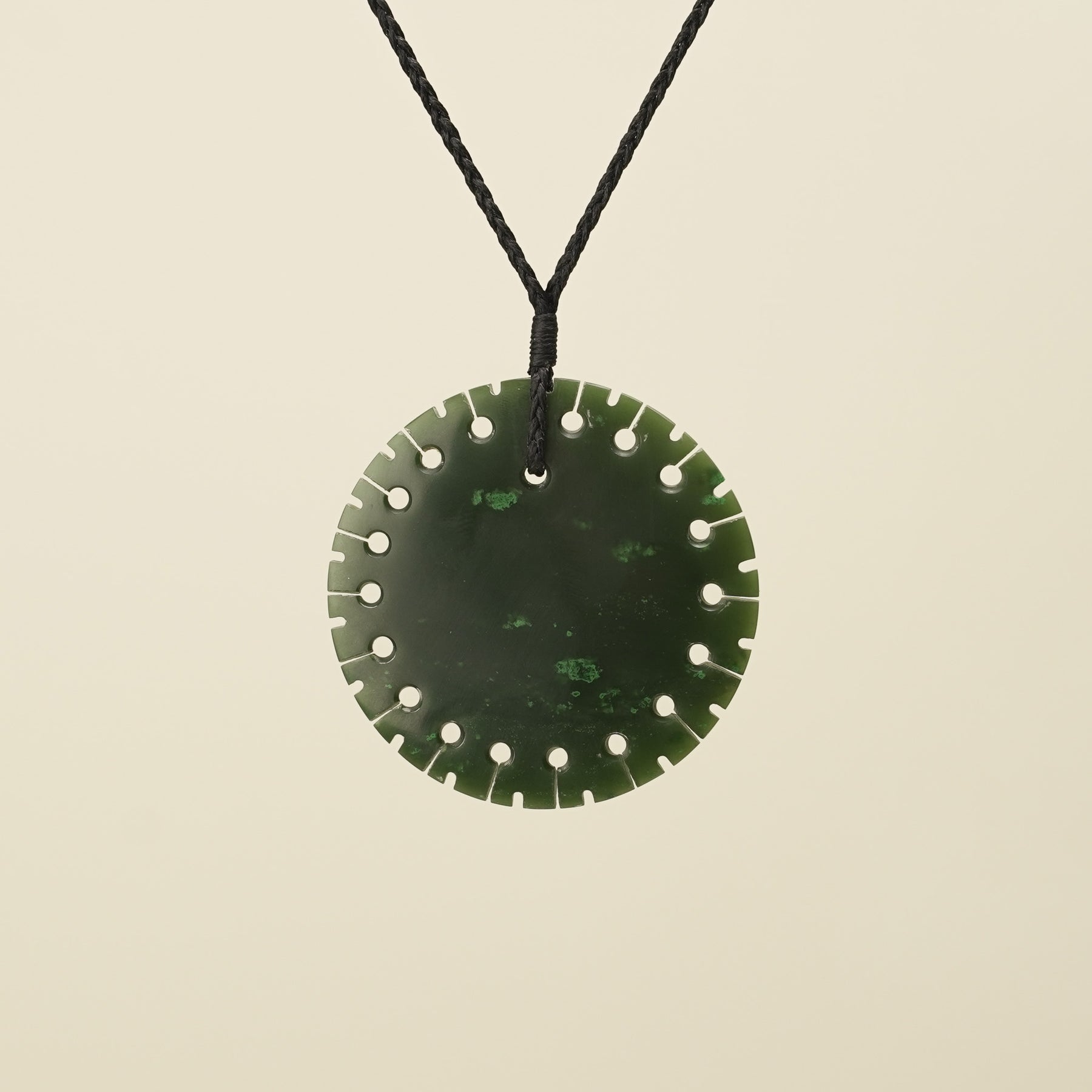 The large Porowhita pendant embodies the circle of life, symbolising self-discovery and life's continuous cycles. Carved from kawakawa greenstone it showcases beautiful dark green & black tones, with luminous green flecks.