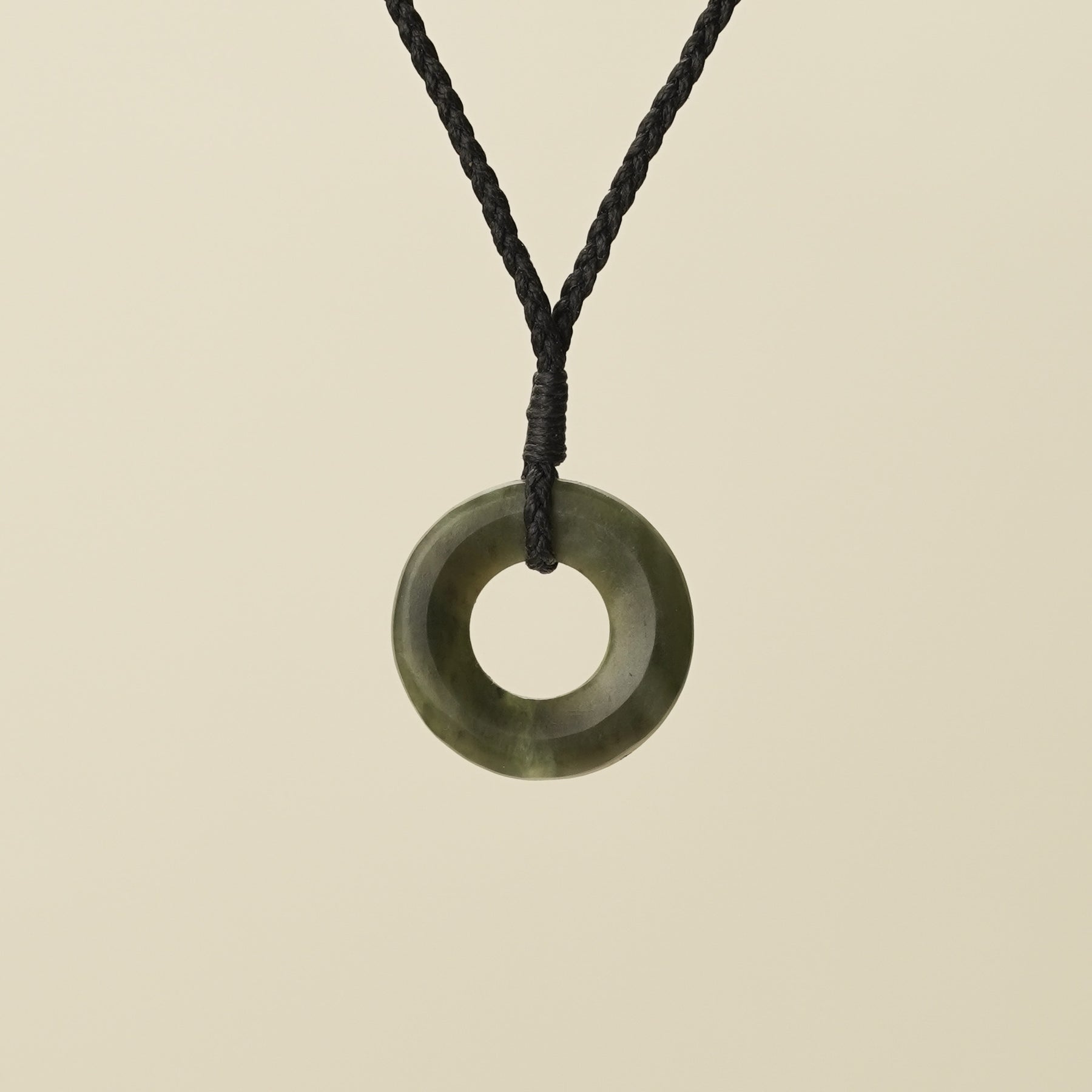 The small Porowhita pendant embodies the circle of life, symbolising self-discovery and life's continuous cycles. Carved from dark kawakawa greenstone, its rich black-green hues reflect the beauty of these journeys. Paired with an adjustable black handwoven wax cord and presented in an eco-friendly box, it's a thoughtful taonga with meaning and care cards included.