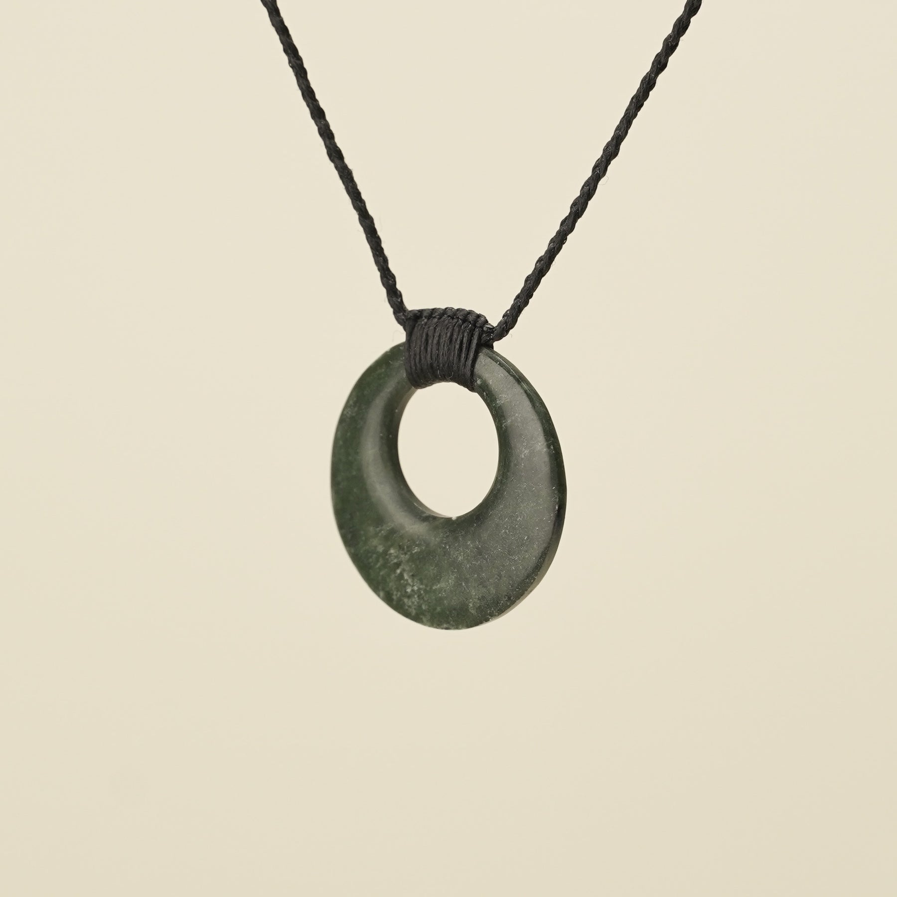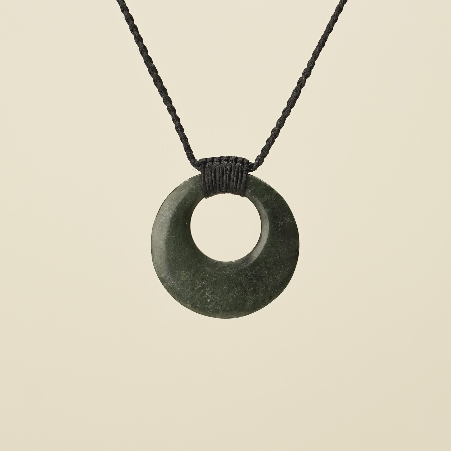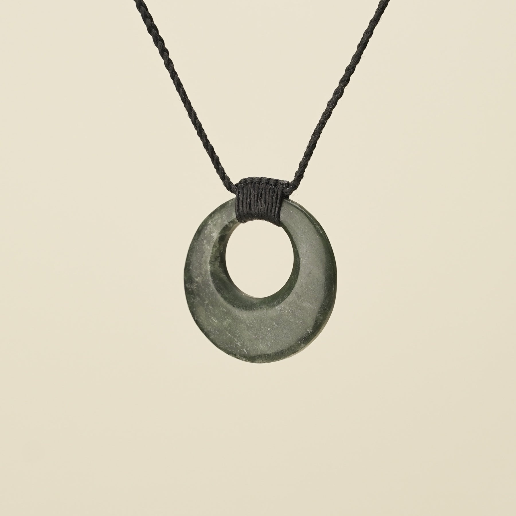 The small Porowhita pendant embodies the circle of life, symbolising self-discovery and life's continuous cycles. Carved from kawakawa greenstone, its rich green hues reflect the beauty of these journeys. Paired with an adjustable black handwoven wax cord and presented in an eco-friendly box, it's a thoughtful taonga with meaning and care cards included.