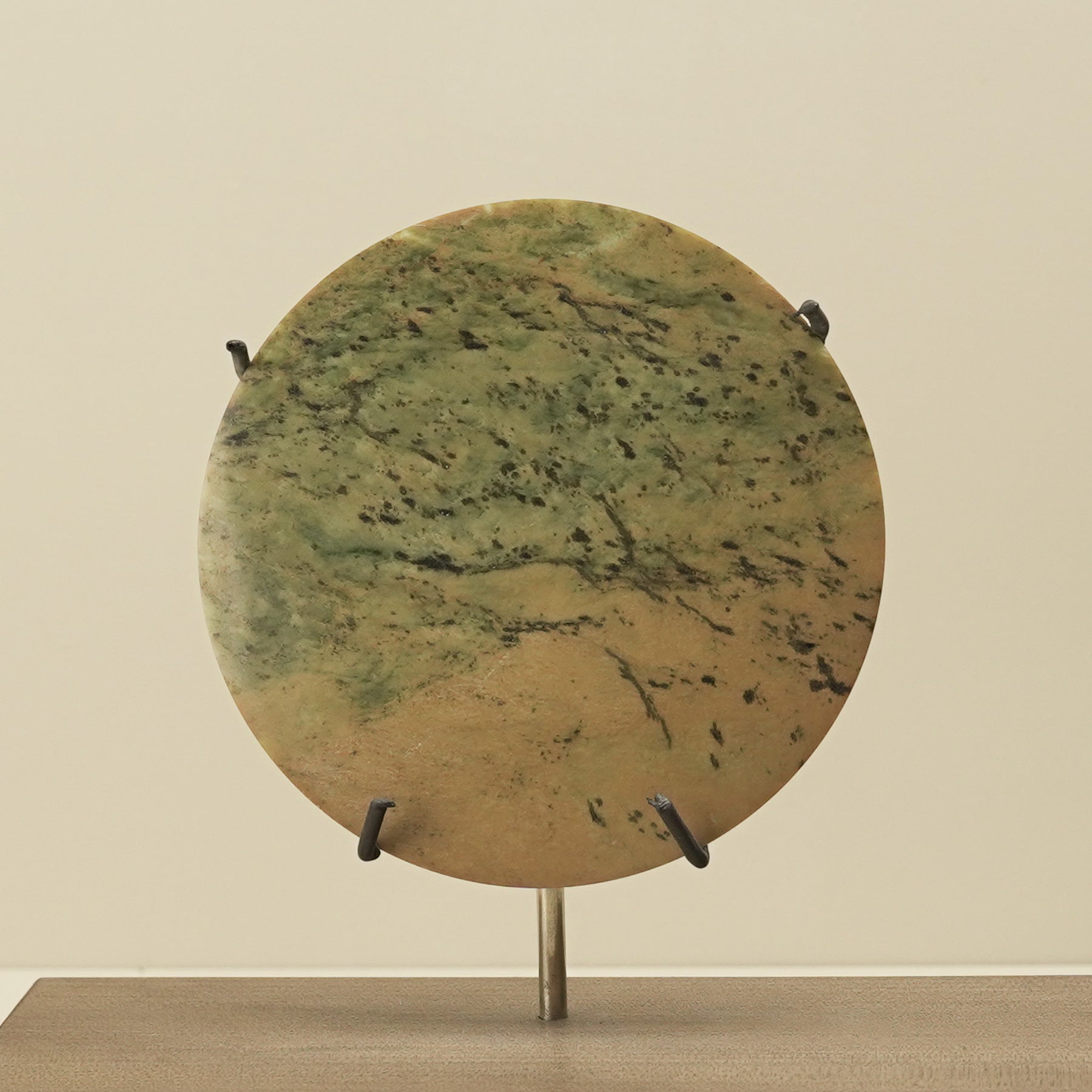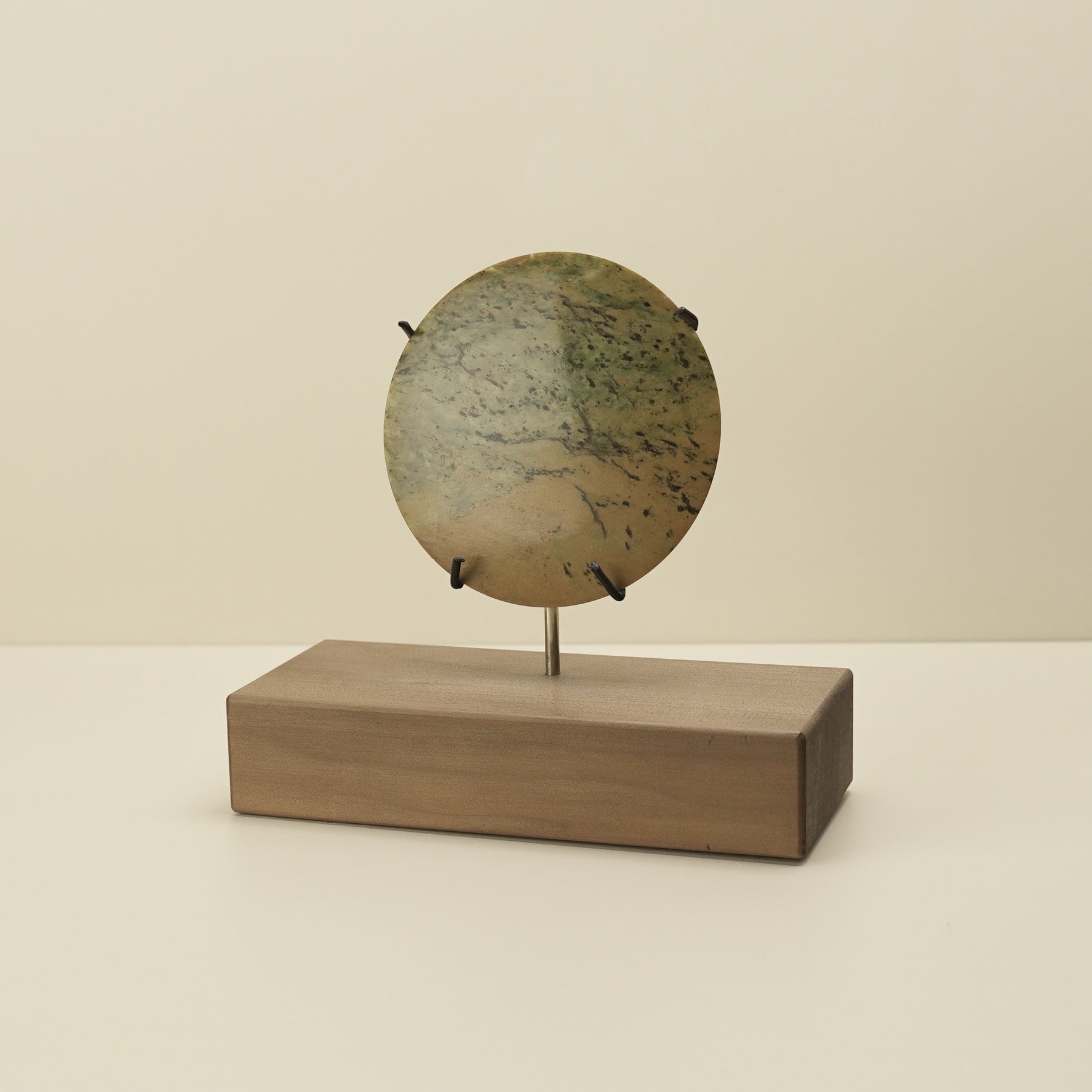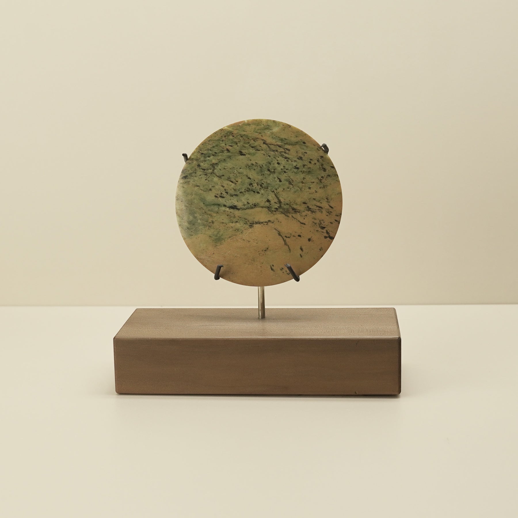 Carved in Hamilton by Alex Sands, this Raukaraka pounamu porowhita (disc) is shaped from stone sourced on the West Coast of the South Island. Resting on a native-wood base, it holds a graceful presence. Warm green and sandy tones ripple through the stone, speckled with dark brown spots. Perfectly circular and finely polished, the porowhita embodies completeness and life’s continuous cycle.