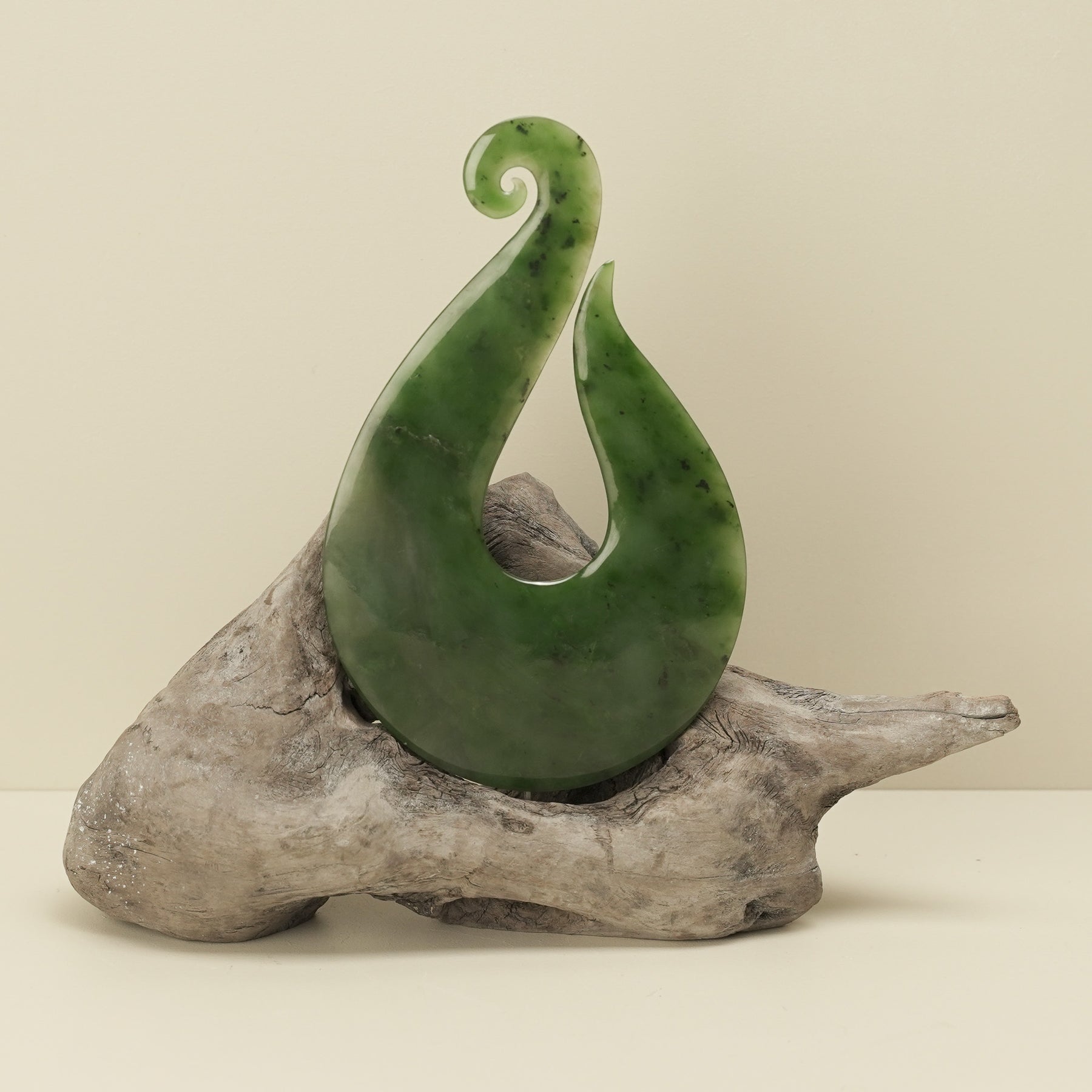 Resting on a driftwood base, the fishhook shape (Hei Matau) speaks to safe passage across water and enduring ties to te moana. It is a symbol of resilience, strength, and the unbroken connection between past and future - a taonga that carries meaning for life’s significant milestones.