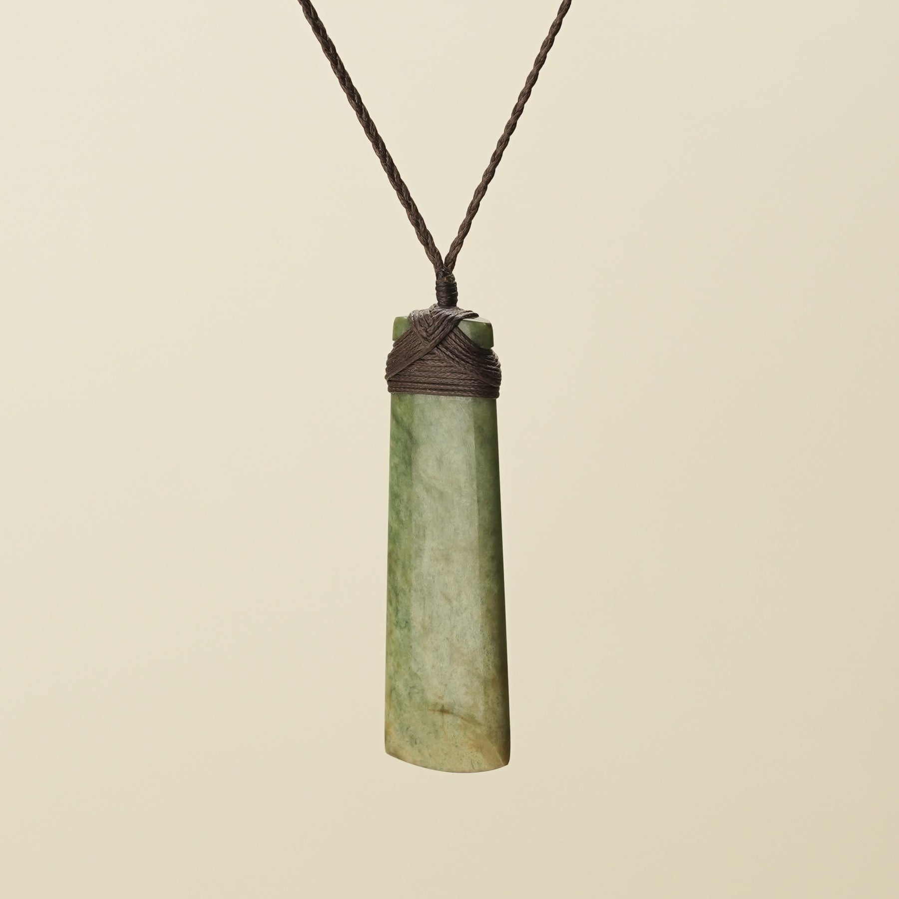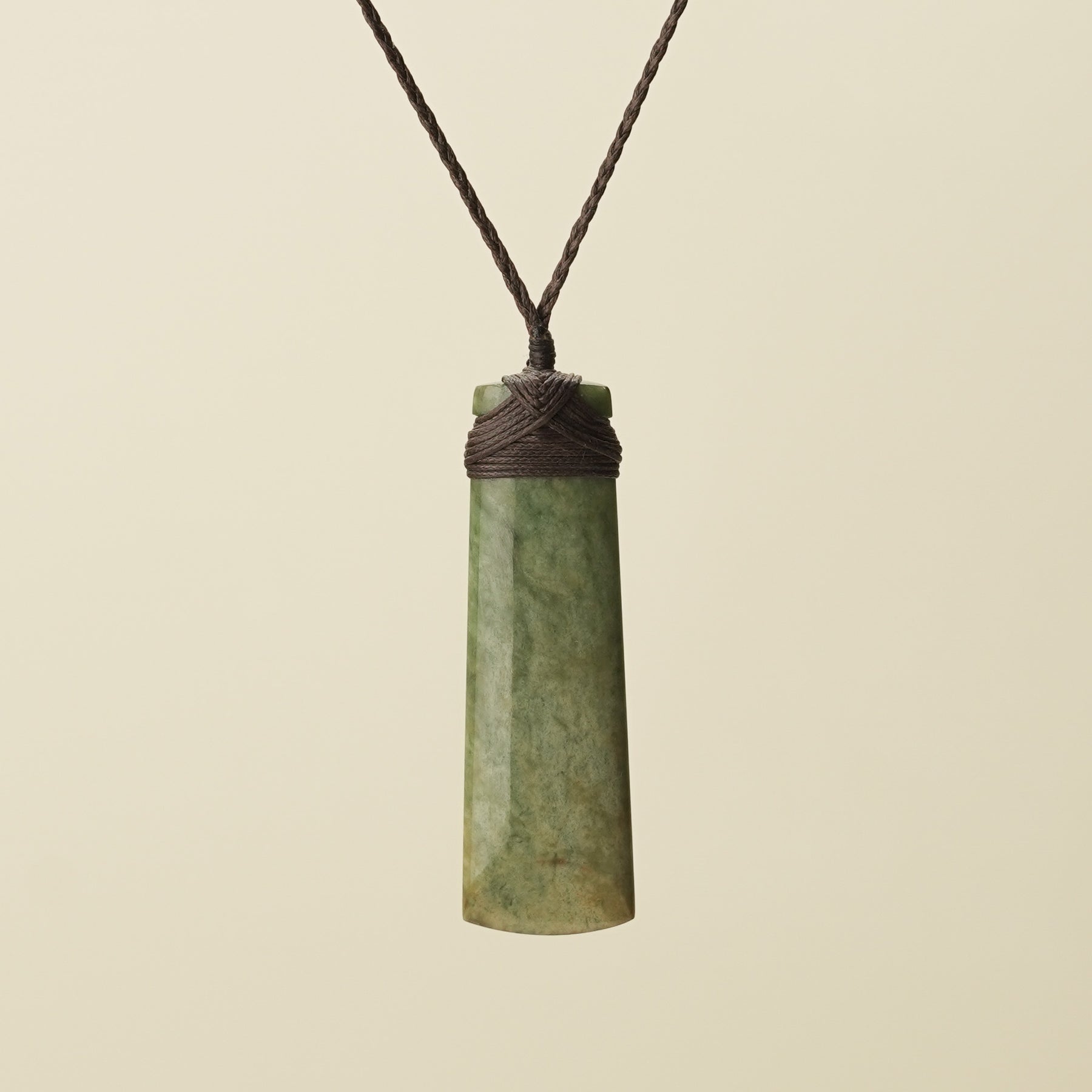 Carved in our Arrowtown workshop from rich Raukaraka pounamu, this one-off Toki pendant symbolises strength and leadership. Its calm green tones and orange & yellow streaks with a polished finish, beautifully highlight the natural beauty of Aotearoa’s pounamu. Paired with an adjustable handwoven brown cord for a personalised fit, this remarkable Toki is elegantly presented in an eco-friendly box, accompanied by cards detailing its meaning and care—a truly cherished taonga.
