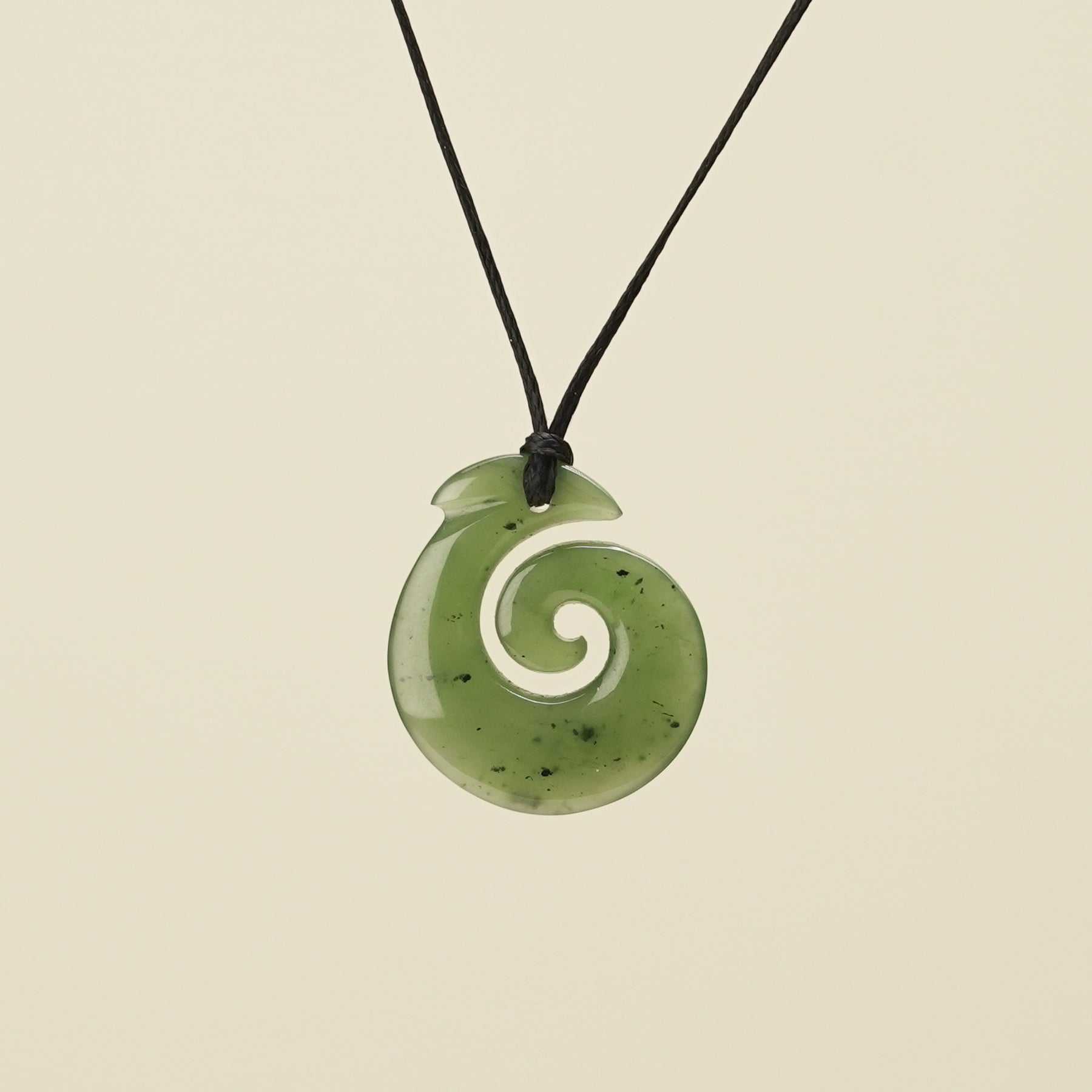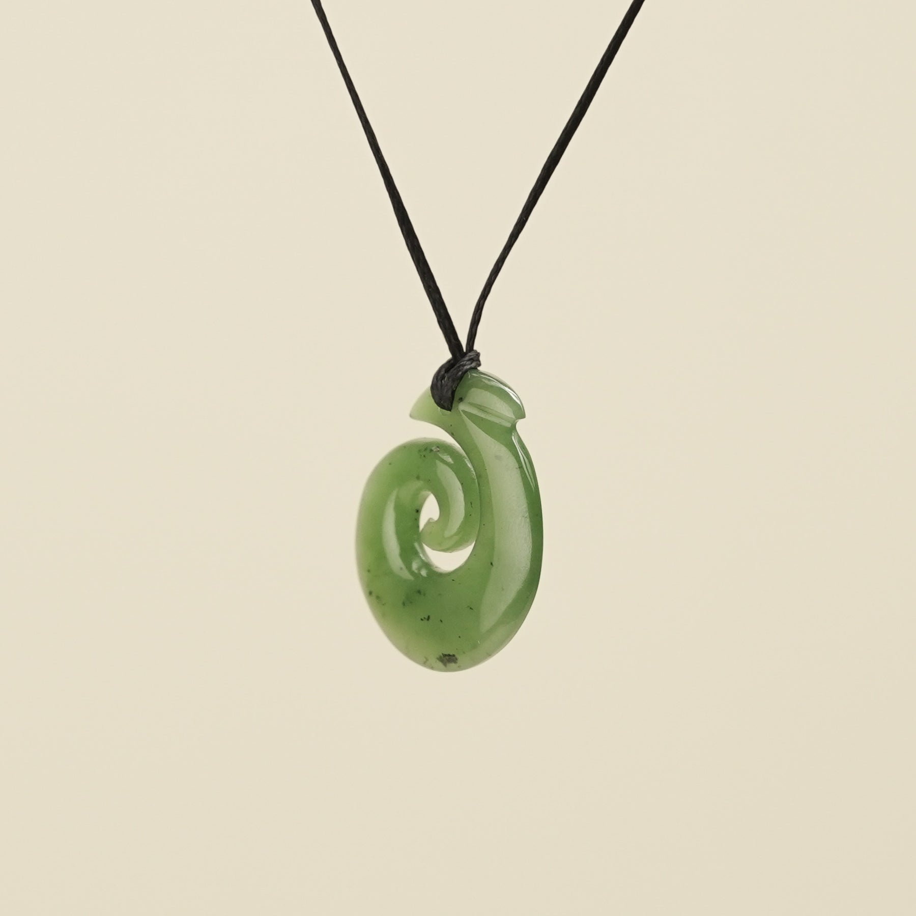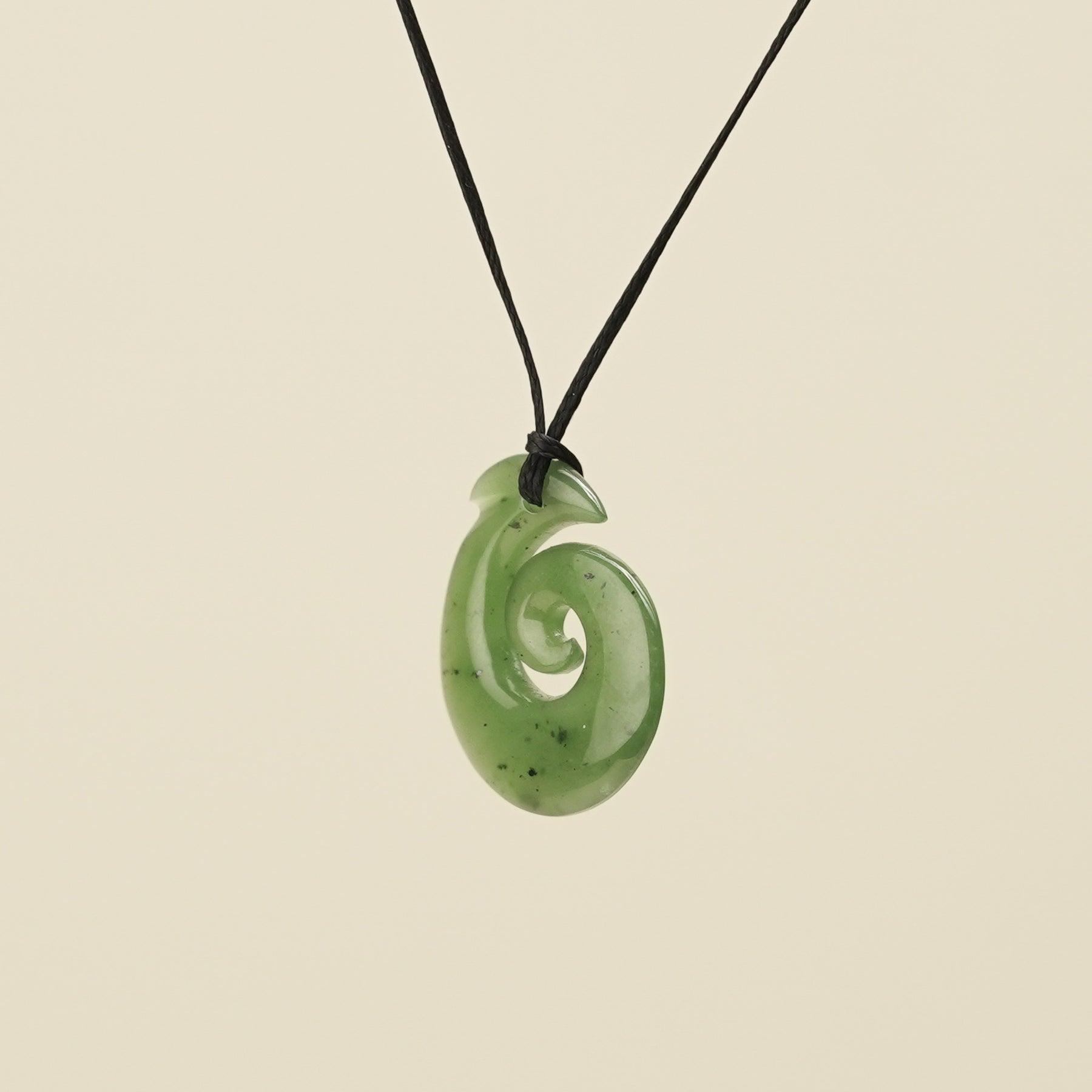 The Koru symbol and Hei Matau (fish hook) together represent the harmonious balance between whenua (land) and moana (sea). The Koru signifies new beginnings and personal growth, while the Hei Matau symbolises strength, perseverance, and safe journeys across water.