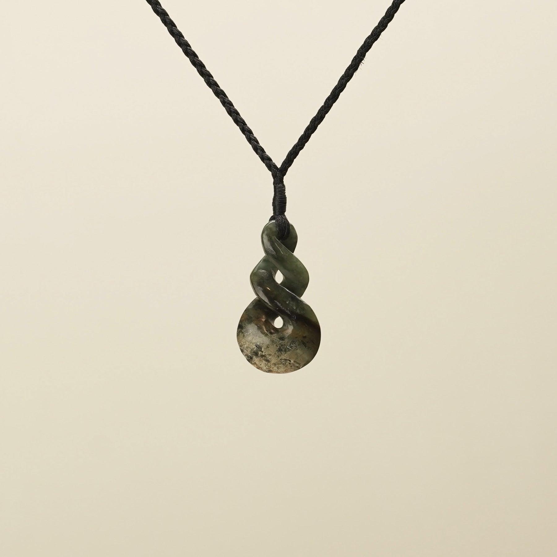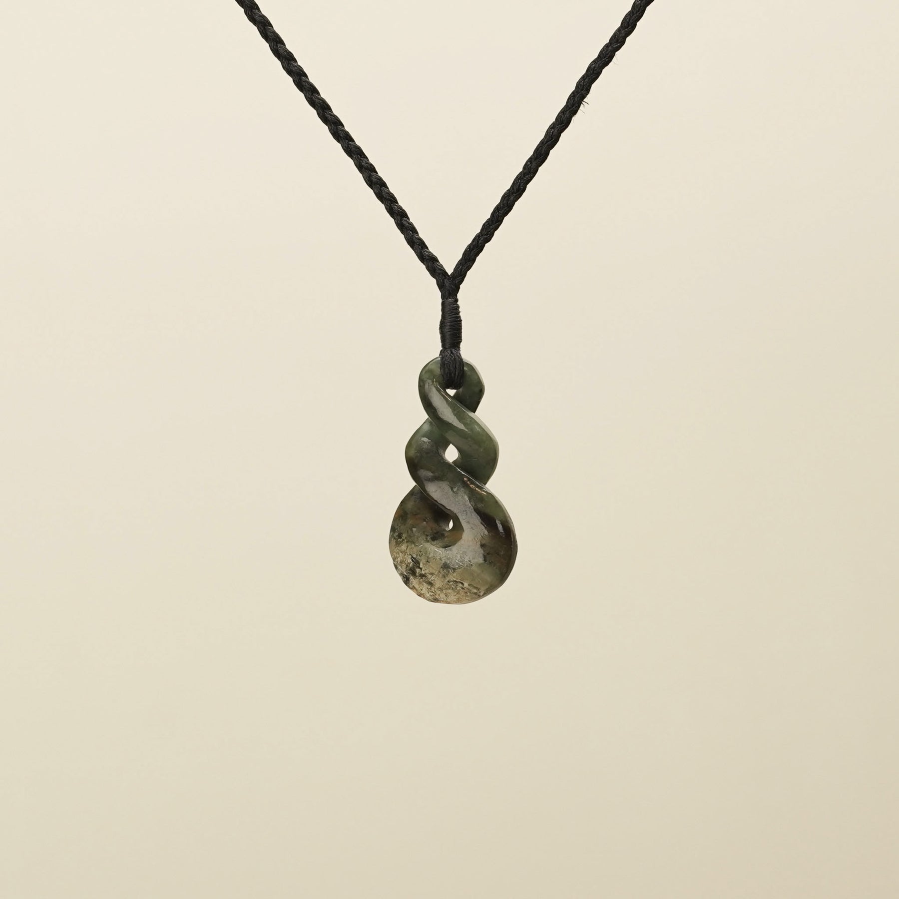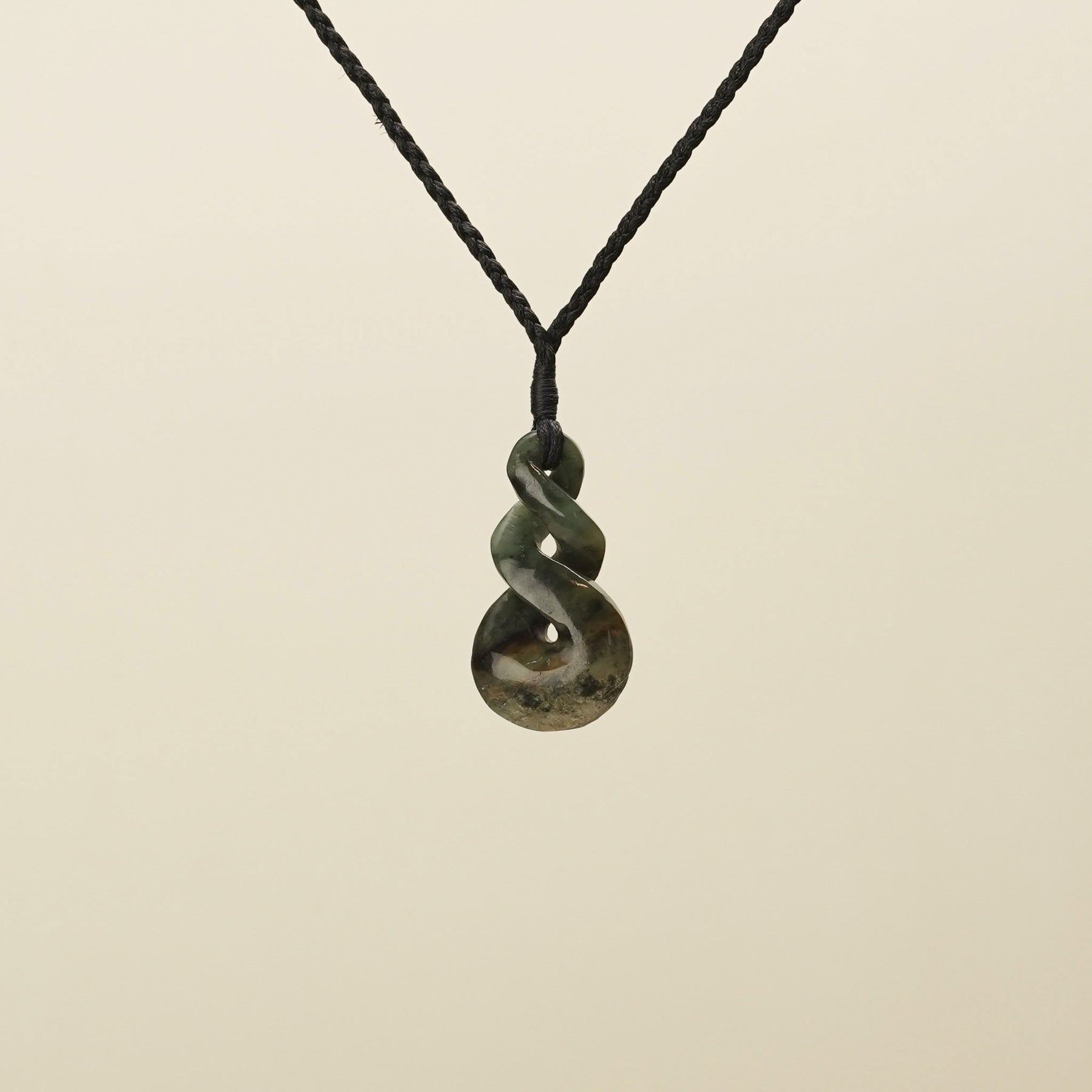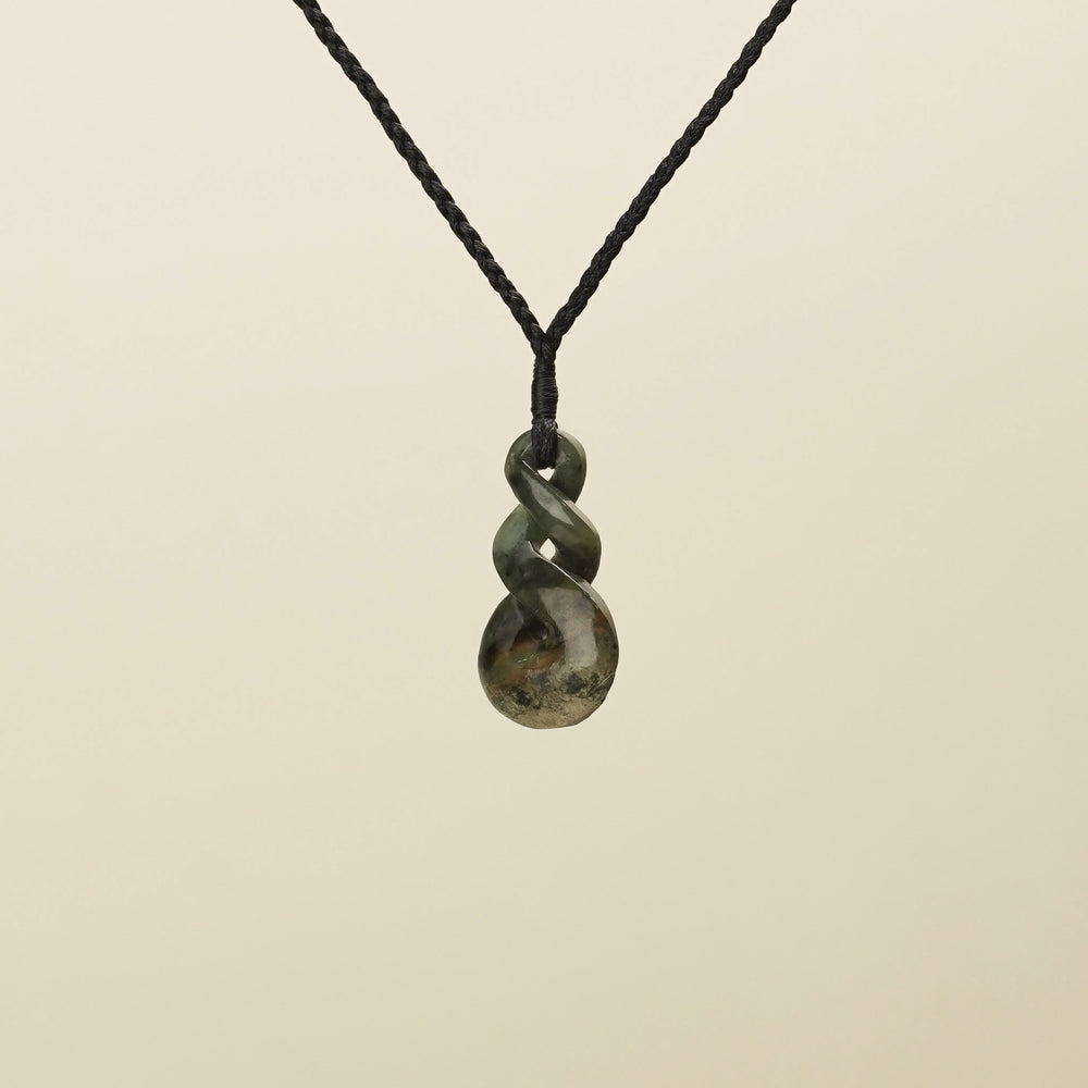 Carved from New Zealand Raukaraka Pounamu, this Pikorua pendant symbolises the intertwining of lives. Showcasing deep greens with yellow and orange tones intertwining, its beautiful colouring is highlighted by its matte finish. The twist represents connections of friendship, whānau, and aroha, celebrating the shared journey of individuals. It includes a handwoven black wax cord and is presented in an eco-friendly box with meaning cards that convey its cultural significance and care instructions.