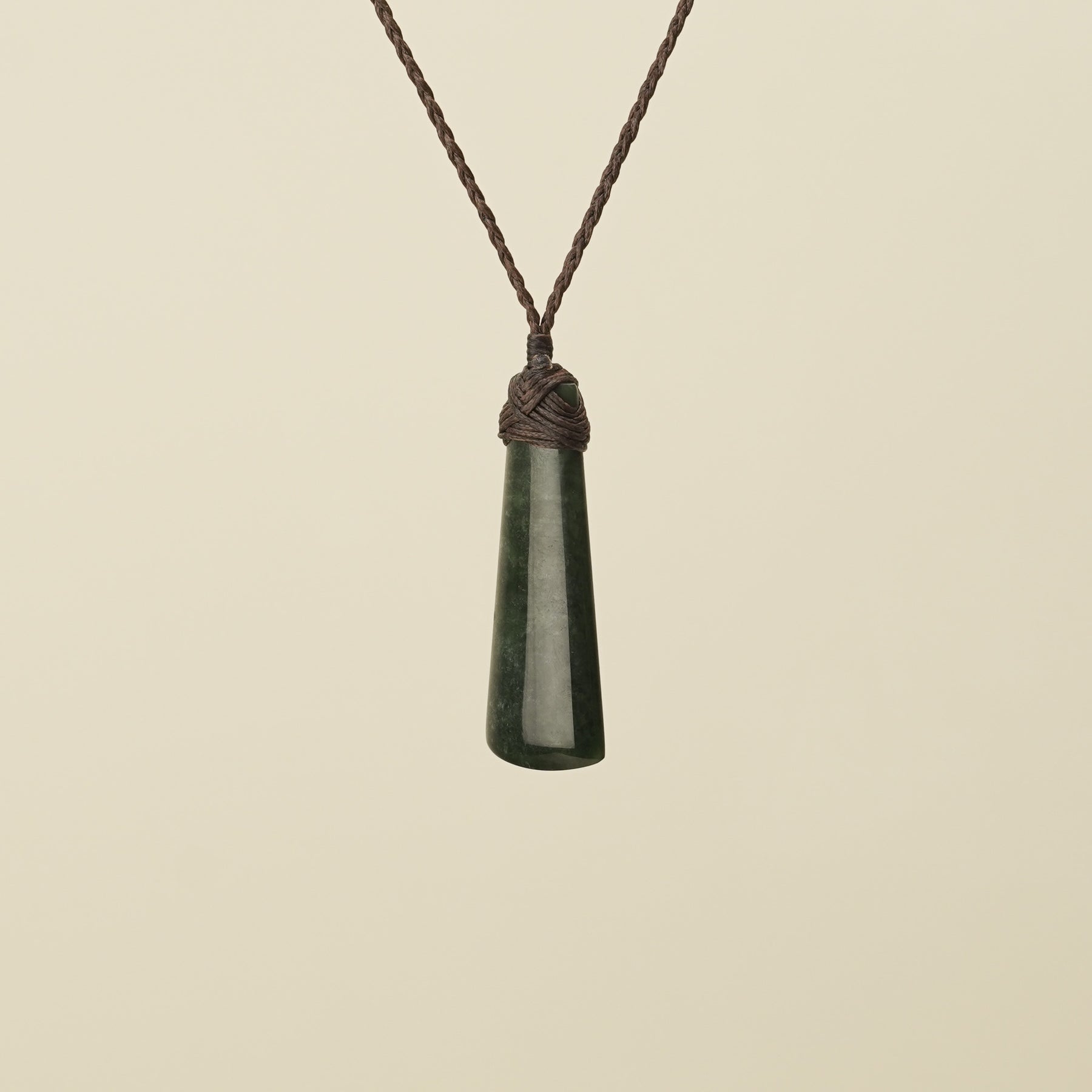 Carved in our Arrowtown workshop from rich Hapopo pounamu, this one-off extra small Toki pendant symbolises strength and leadership. Its soft green tones, and mossy veining enhanced by its polished finish, beautifully highlight the natural beauty of Aotearoa’s pounamu. Paired with an adjustable handwoven brown cord for a personalised fit, this remarkable Toki is elegantly presented in an eco-friendly box, accompanied by cards detailing its meaning and care—a truly cherished taonga.