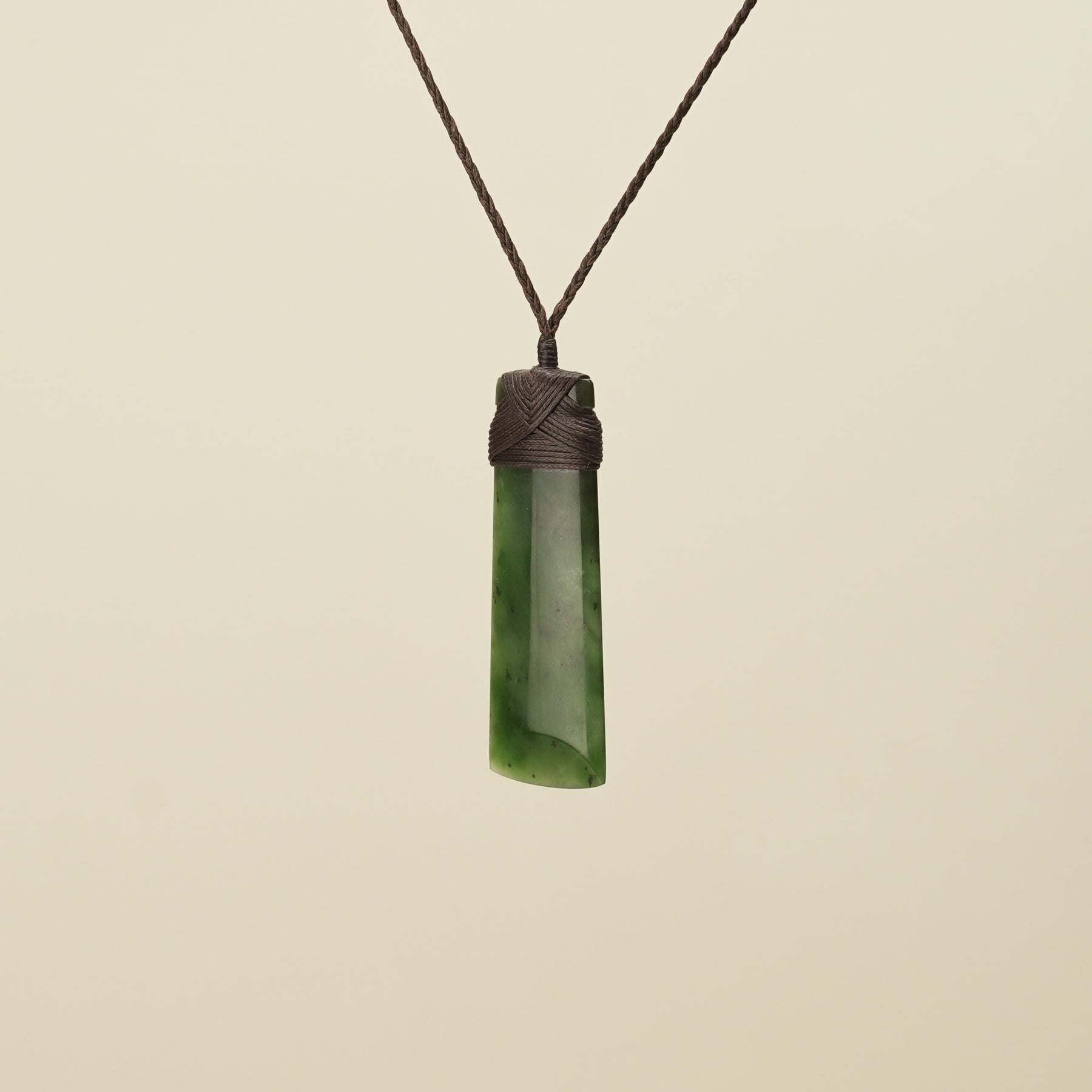 Carved in our Arrowtown workshop from rich Kahurangi pounamu, this one-off large Toki pendant symbolises strength and leadership. Its bright green tones enhanced by its polished finish, beautifully highlight the natural beauty of Aotearoa’s pounamu. Paired with an adjustable handwoven brown cord for a personalised fit, this remarkable Toki is elegantly presented in an eco-friendly box, accompanied by cards detailing its meaning and care—a truly cherished taonga.