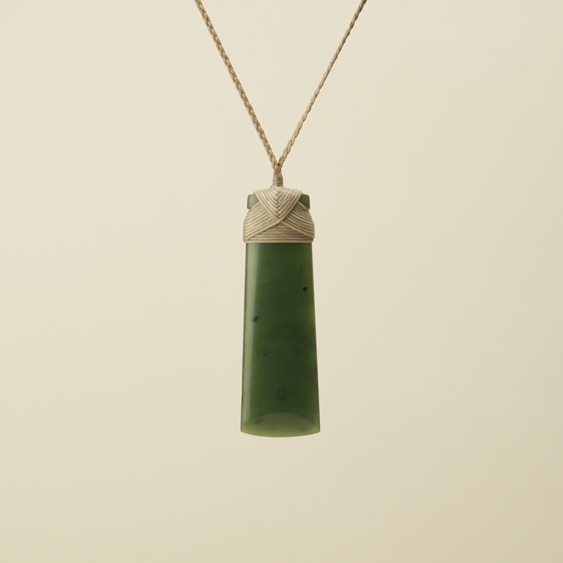Carved in our Arrowtown workshop from rich Kahurangi pounamu, this one-off extra large Toki pendant symbolises strength and leadership. Its bright green tones enhanced by its matte finish, beautifully highlight the natural beauty of Aotearoa’s pounamu. Paired with an adjustable handwoven tan cord for a personalised fit, this remarkable Toki is elegantly presented in an eco-friendly box, accompanied by cards detailing its meaning and care—a truly cherished taonga.