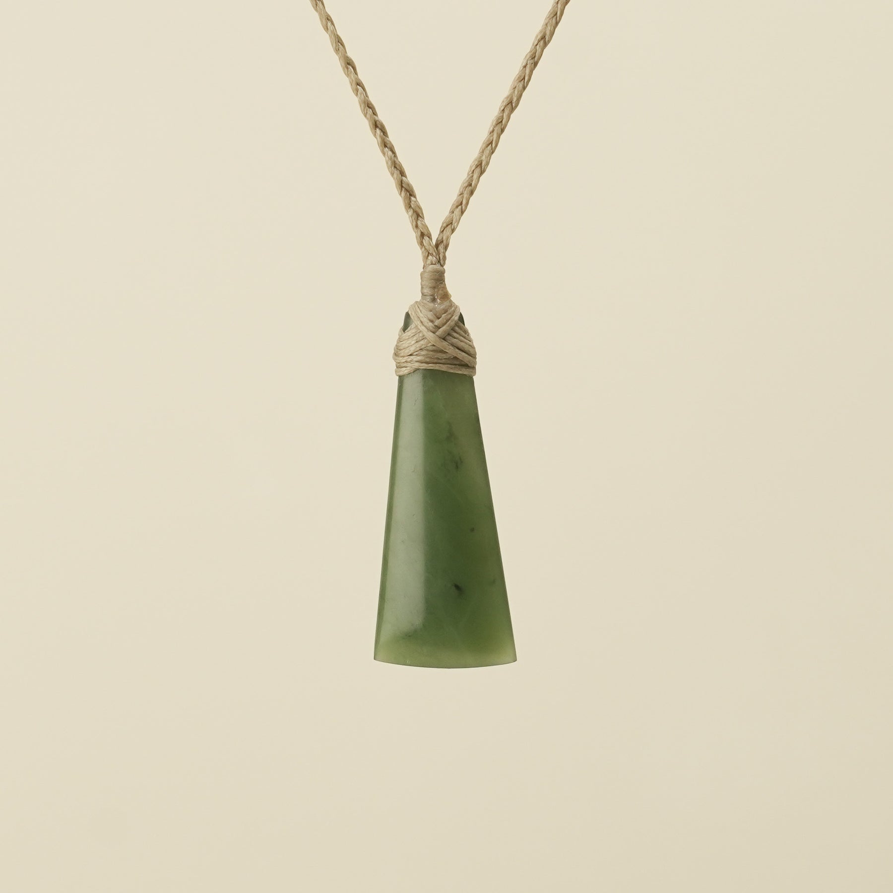 Carved in our Arrowtown workshop from rich kahurangi pounamu, this one-off Toki pendant symbolises strength and leadership. Its calm green tones with a matte finish, beautifully highlight the natural beauty of Aotearoa’s pounamu. Paired with an adjustable handwoven tan cord for a personalised fit, this remarkable Toki is elegantly presented in an eco-friendly box, accompanied by cards detailing its meaning and care—a truly cherished taonga.