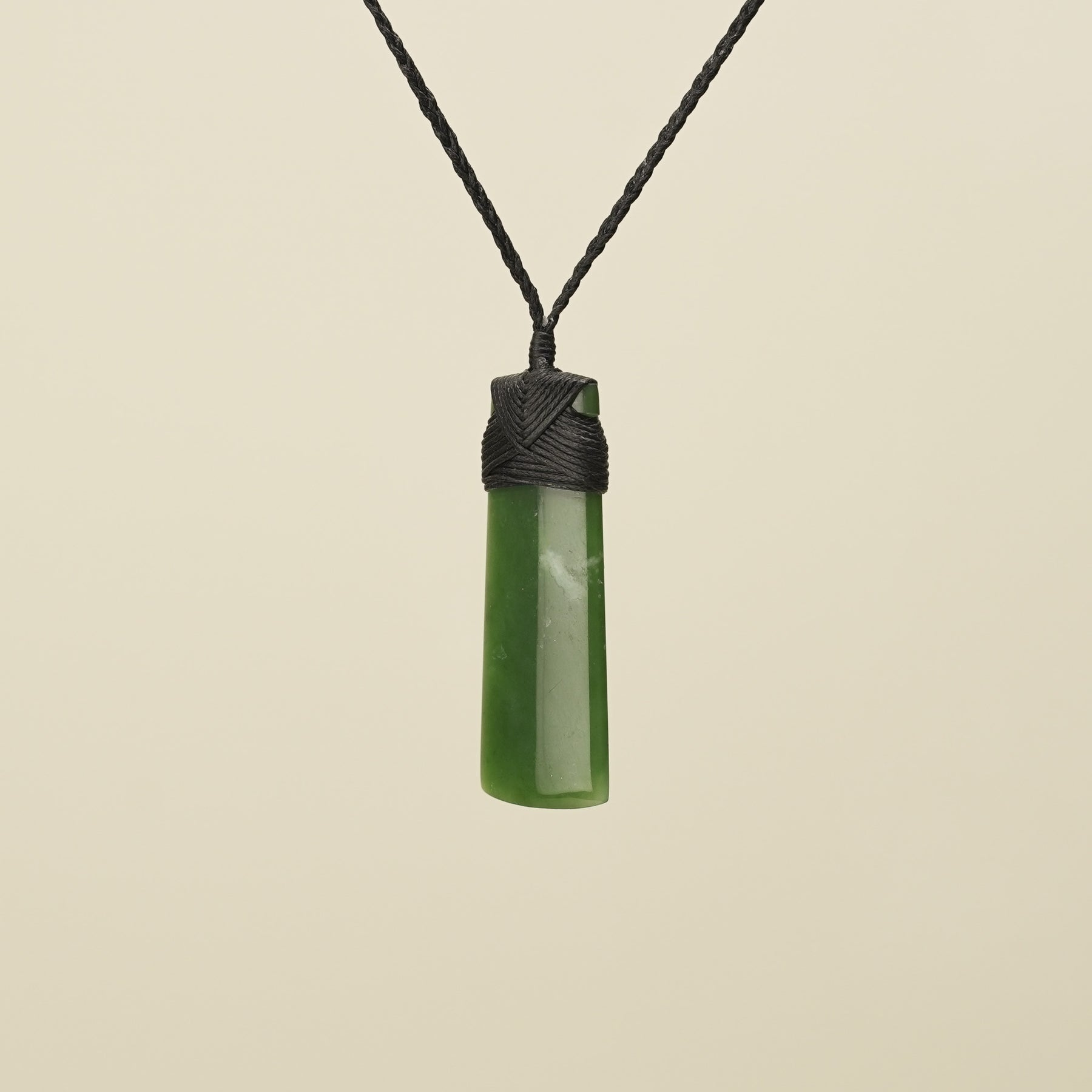 Carved in our Arrowtown workshop from rich kahurangi pounamu, this one-off Toki pendant symbolises strength and leadership. Its calm green tones with a polished finish, beautifully highlight the natural beauty of Aotearoa’s pounamu. Paired with an adjustable handwoven black cord for a personalised fit, this remarkable Toki is elegantly presented in an eco-friendly box, accompanied by cards detailing its meaning and care—a truly cherished taonga.