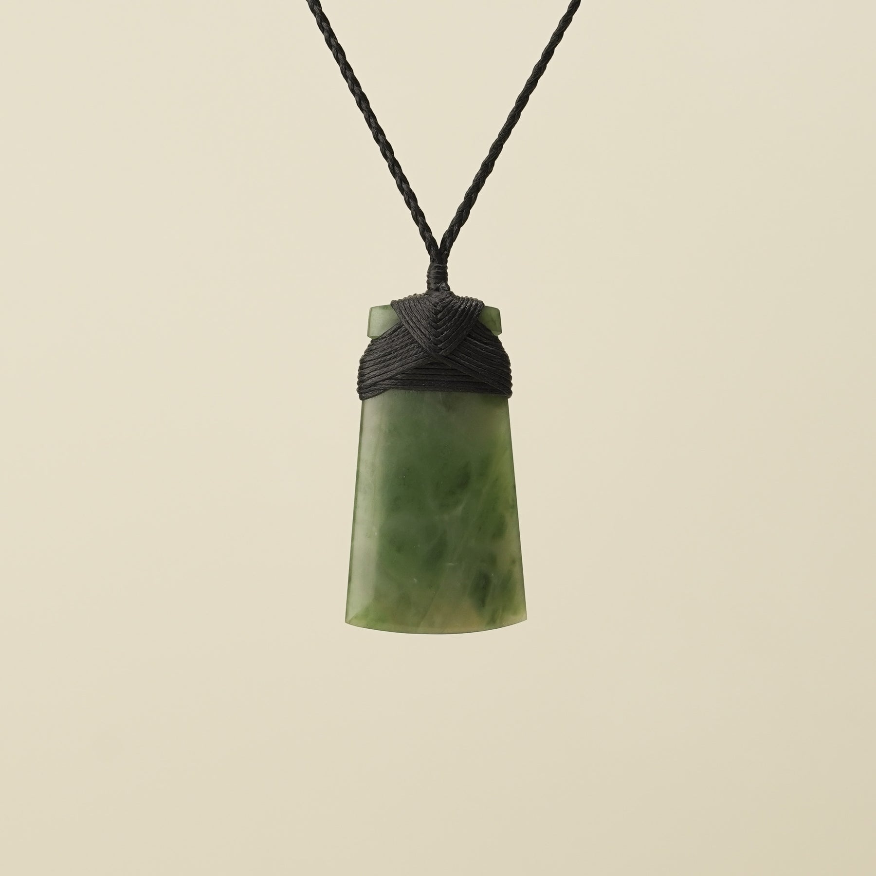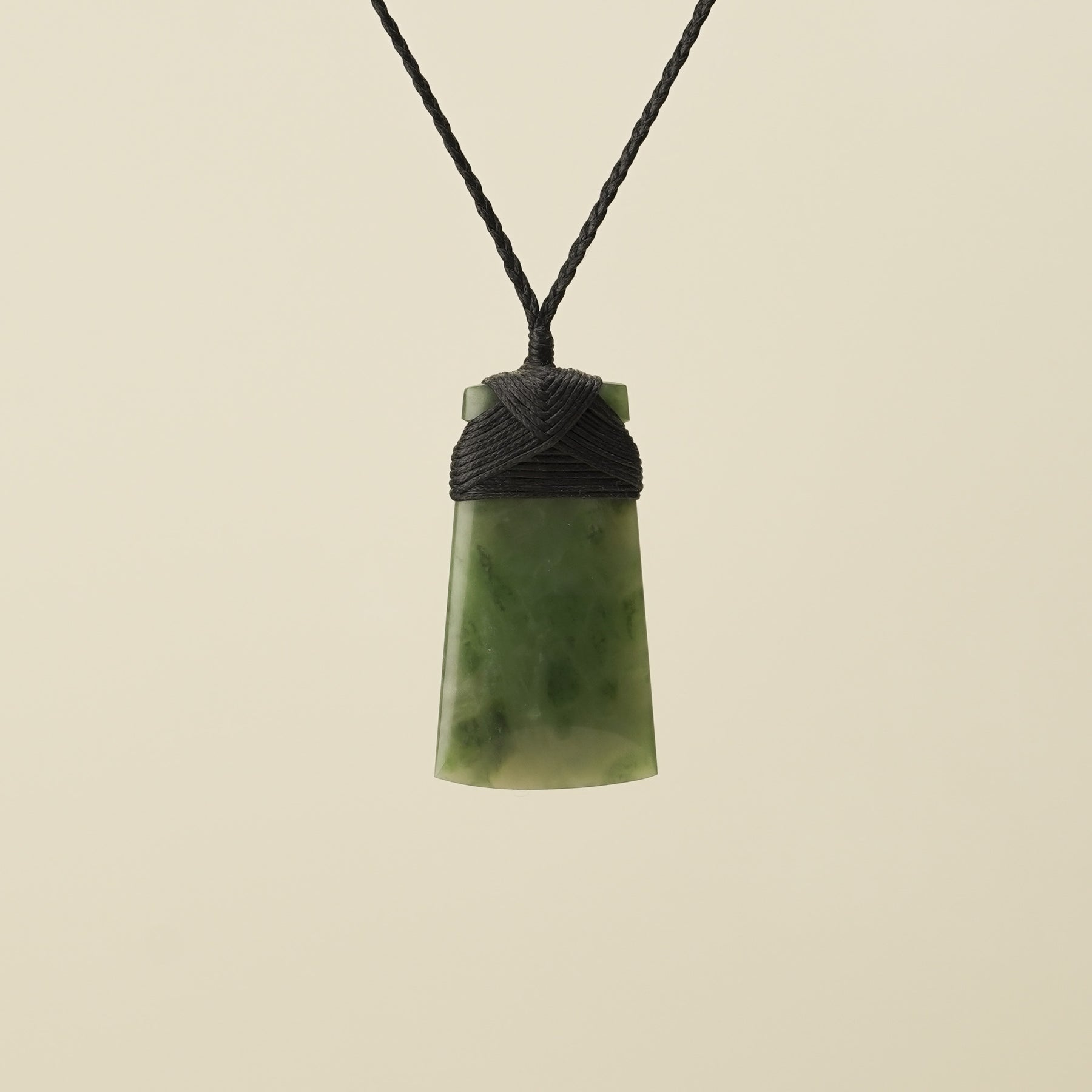 Carved in our Arrowtown workshop from rich Kahurangi pounamu, this one-off Toki pendant symbolises strength and leadership. Its calm green tones with soft marbling enhanced with a matte finish, beautifully highlight the natural beauty of Aotearoa’s pounamu. Paired with an adjustable handwoven black cord for a personalised fit, this remarkable Toki is elegantly presented in an eco-friendly box, accompanied by cards detailing its meaning and care—a truly cherished taonga.