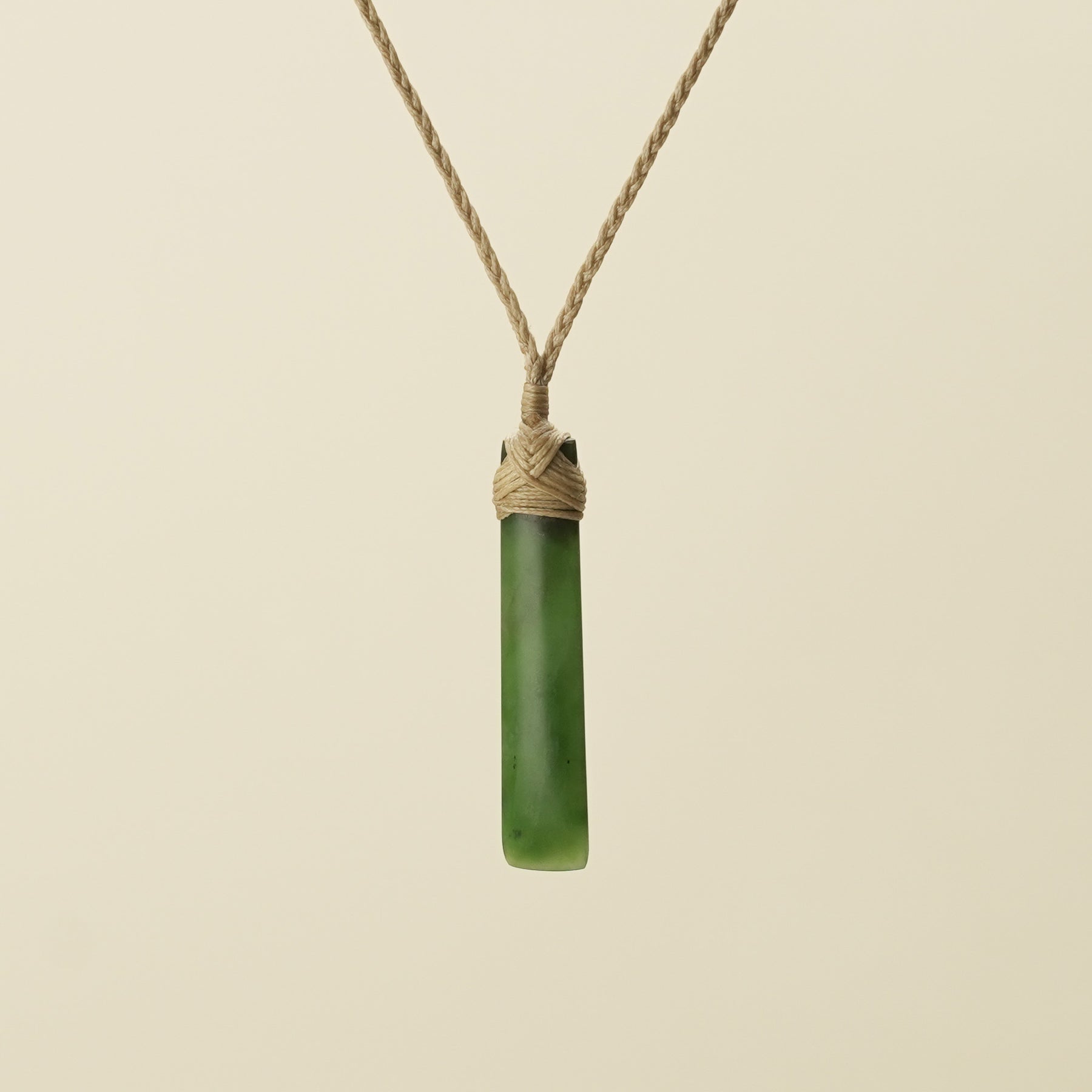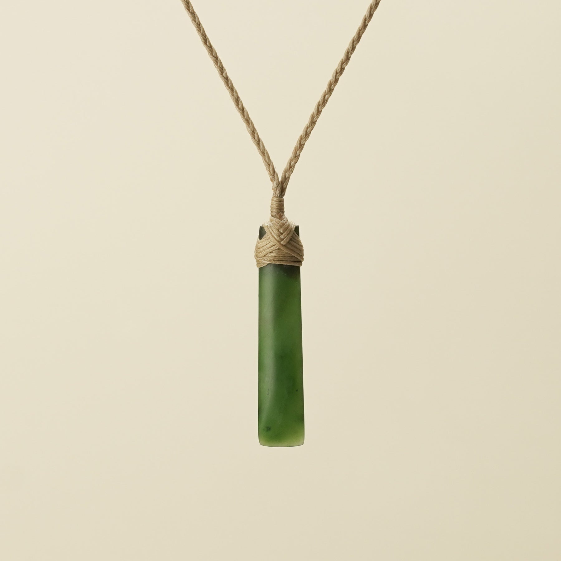 Carved in our Arrowtown workshop from rich kahurangi pounamu, this one-off Toki pendant symbolises strength and leadership. Its calm green tones with a matte finish, beautifully highlight the natural beauty of Aotearoa’s pounamu. Paired with an adjustable handwoven tan cord for a personalised fit, this remarkable Toki is elegantly presented in an eco-friendly box, accompanied by cards detailing its meaning and care—a truly cherished taonga.