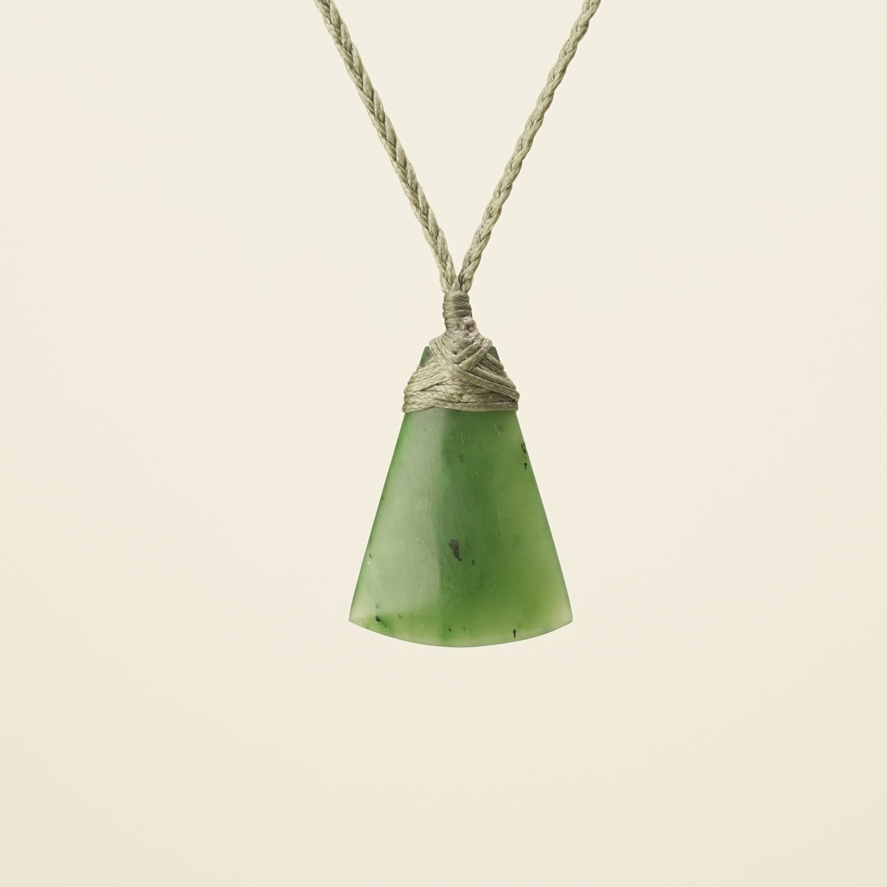 Carved in our Arrowtown workshop from rich kahurangi pounamu, this one-off Toki pendant symbolises strength and leadership. Its calm green tones with a semi matte finish, beautifully highlight the natural beauty of Aotearoa’s pounamu. Paired with an adjustable handwoven khaki cord for a personalised fit, this remarkable Toki is elegantly presented in an eco-friendly box, accompanied by cards detailing its meaning and care - a truly cherished taonga.