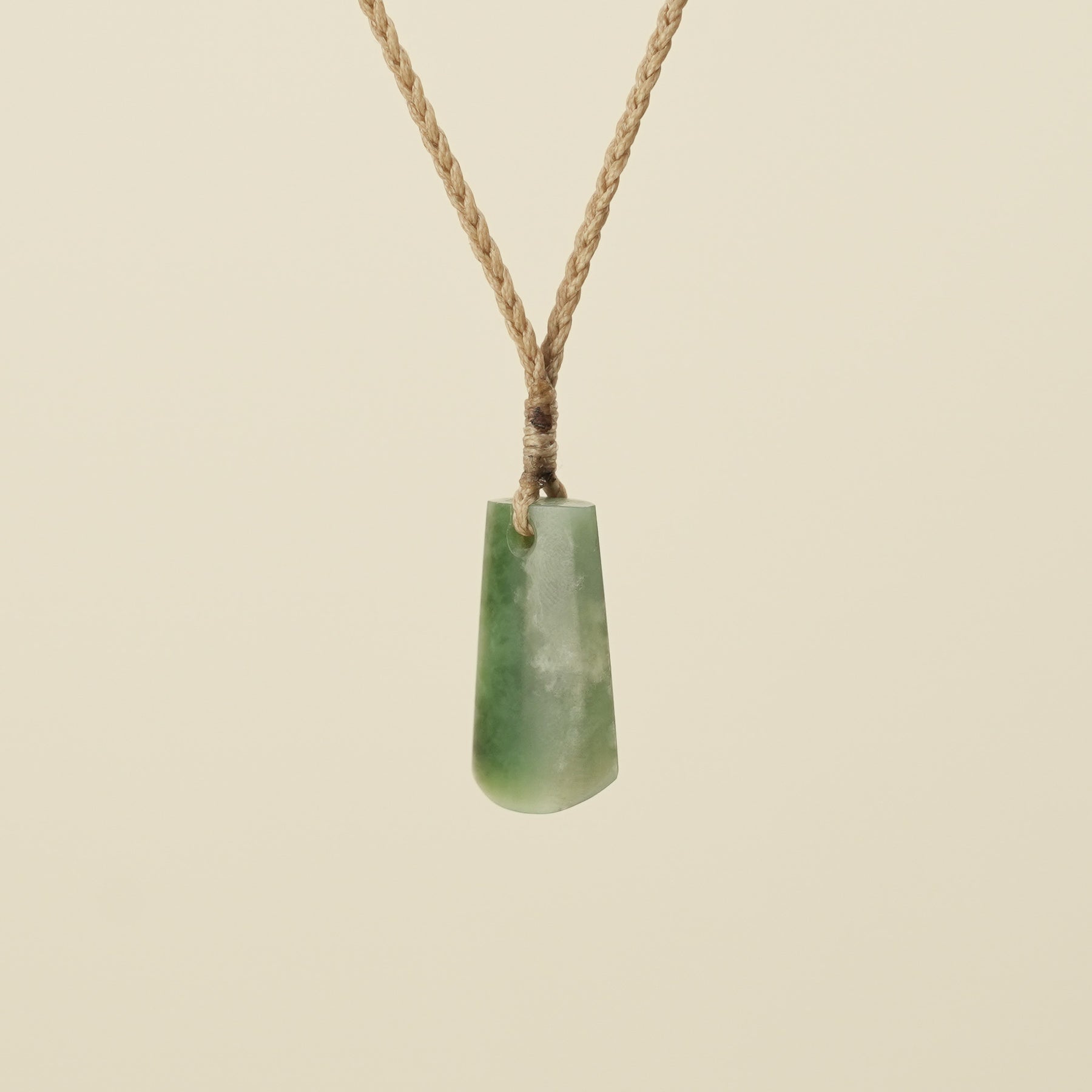 Carved from light Kahurangi pounamu, this one-off extra small Toki pendant symbolises strength and leadership. Its bright green hues, enhanced by its polished finish, beautifully highlight the natural beauty of Aotearoa’s pounamu. Paired with an adjustable handwoven tan cord for a personalised fit, this remarkable Toki is elegantly presented in an eco-friendly box, accompanied by cards detailing its meaning and care—a truly cherished taonga.