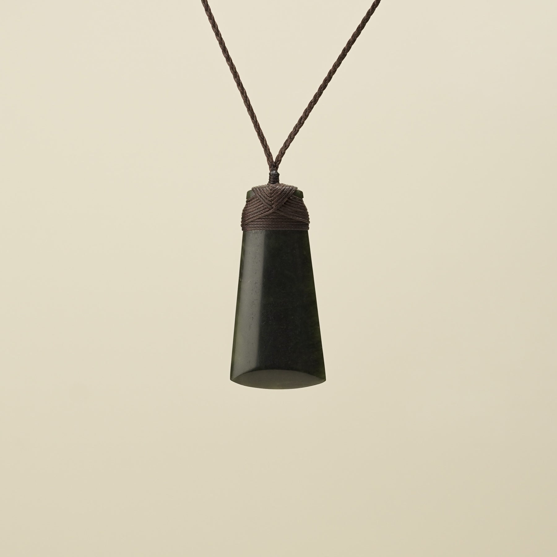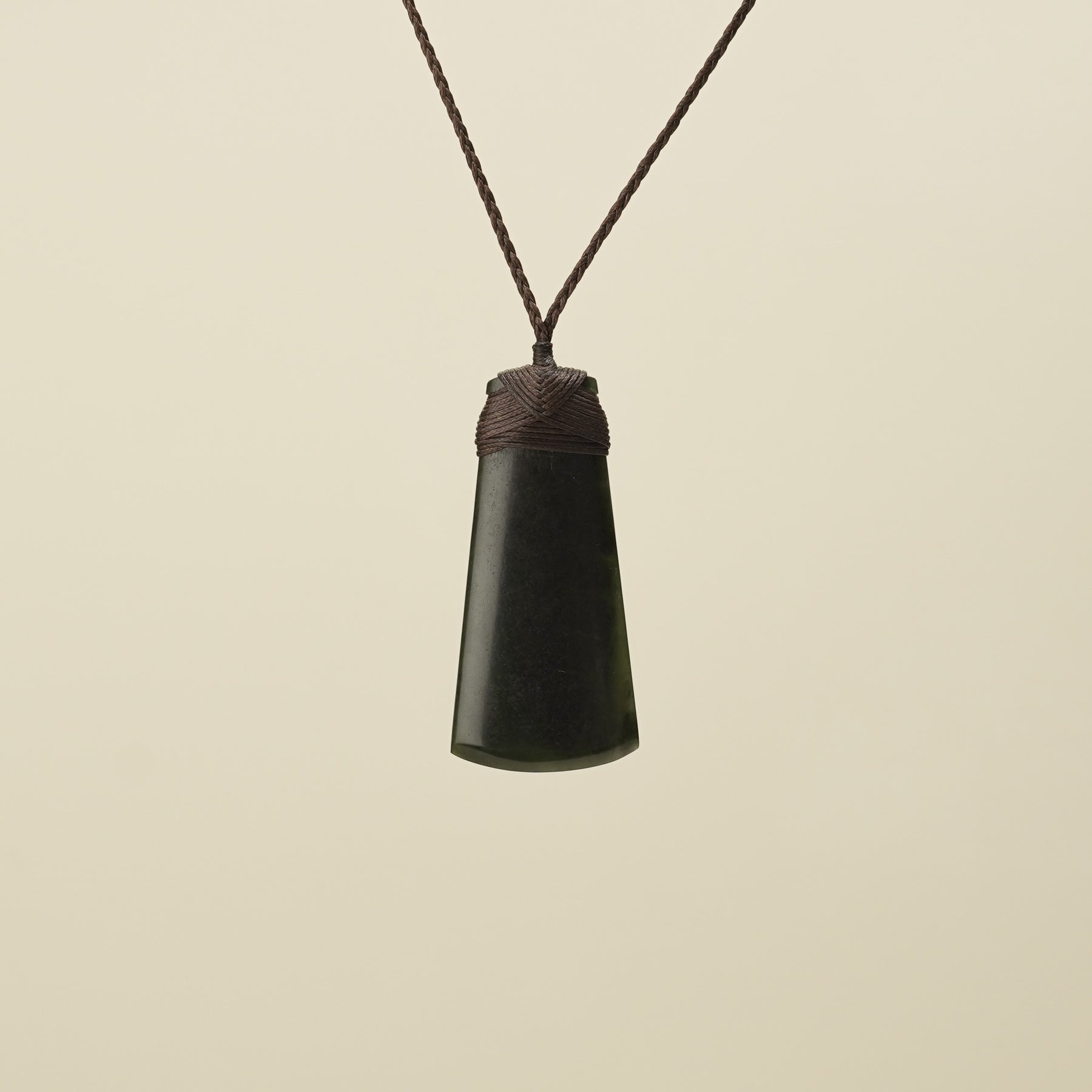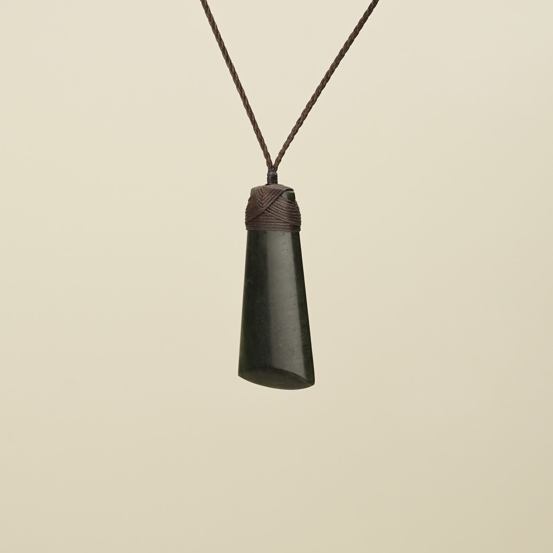 Carved in our Arrowtown workshop from rich Kawakawa pounamu, this one-off large Toki pendant symbolises strength and leadership. Its deep green hues are enhanced by its matte finish, beautifully highlighting the natural beauty of Aotearoa’s pounamu. Paired with an adjustable handwoven brown cord for a personalised fit, this remarkable Toki is elegantly presented in an eco-friendly box, accompanied by cards detailing its meaning and care—a truly cherished taonga.