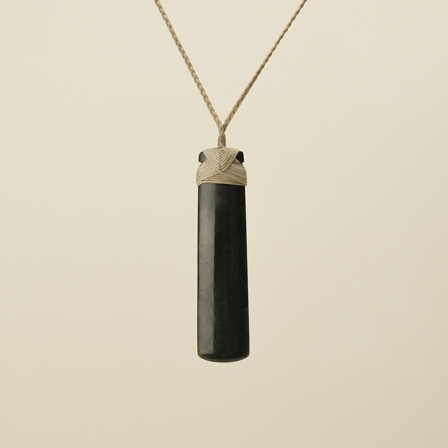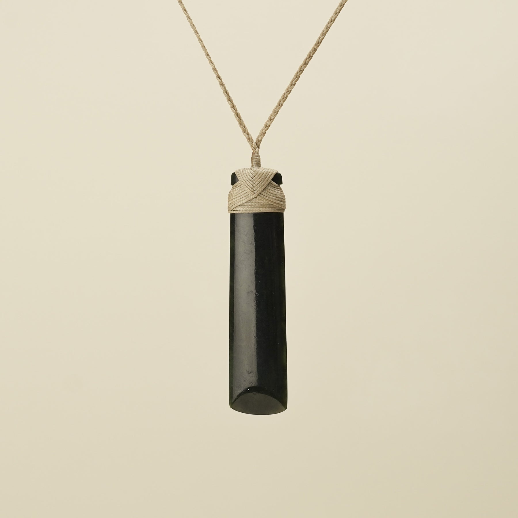Carved in our Arrowtown workshop from rich Kawakawa pounamu, this one-off extra large Toki pendant symbolises strength and leadership. Its deep green tones are enhanced by its polished finish, beautifully highlighting the natural beauty of Aotearoa’s pounamu. Paired with an adjustable handwoven tan cord for a personalised fit, this remarkable Toki is elegantly presented in an eco-friendly box, accompanied by cards detailing its meaning and care—a truly cherished taonga.