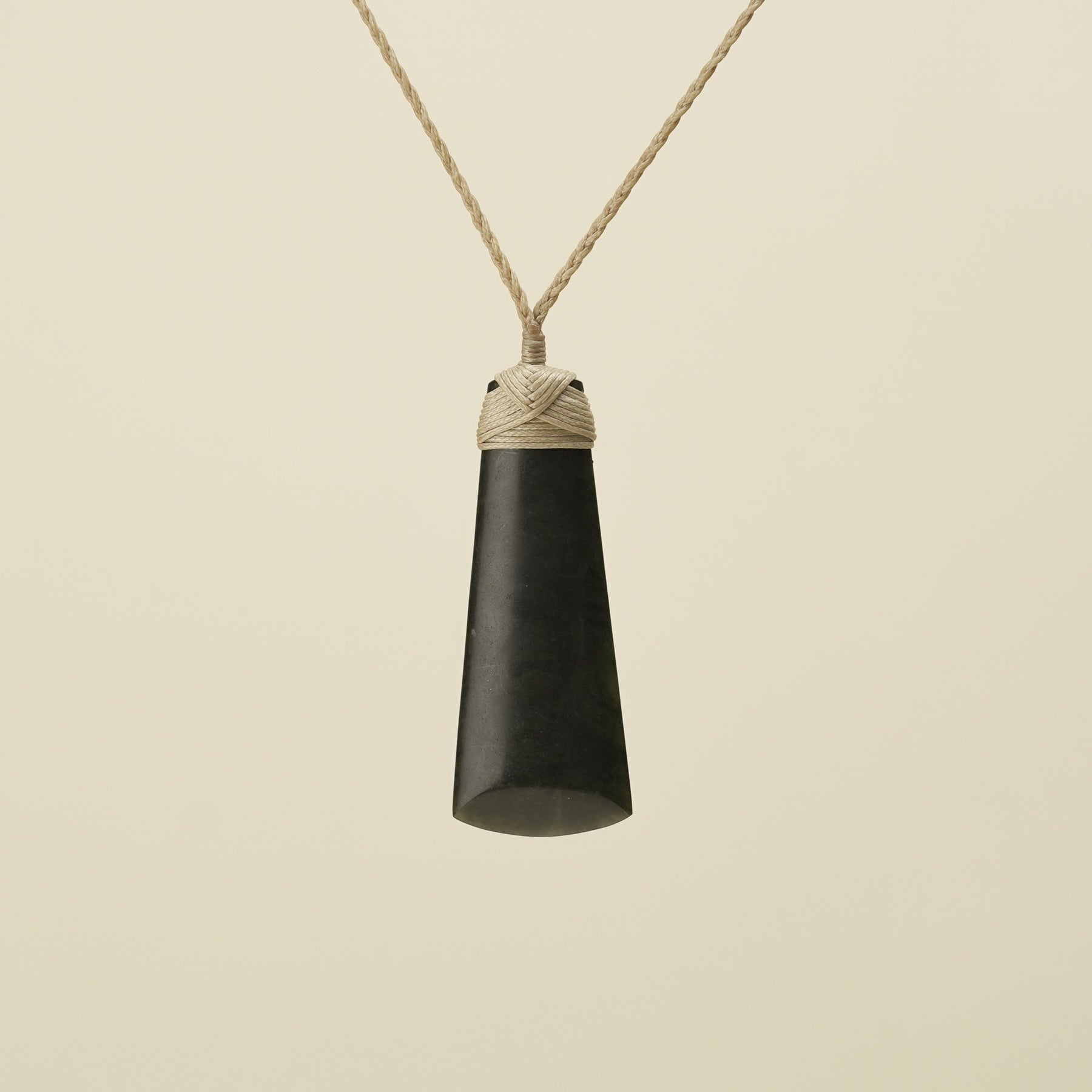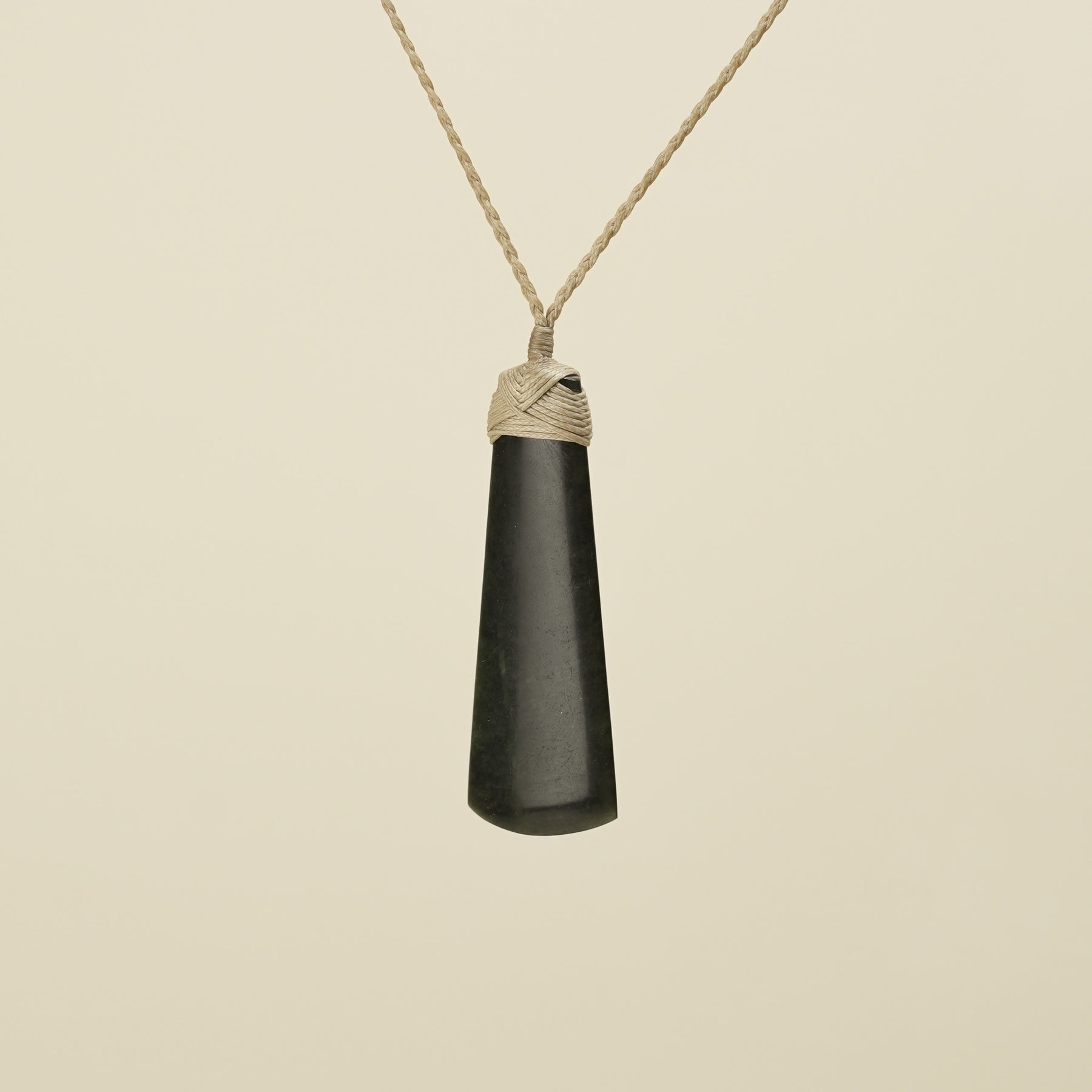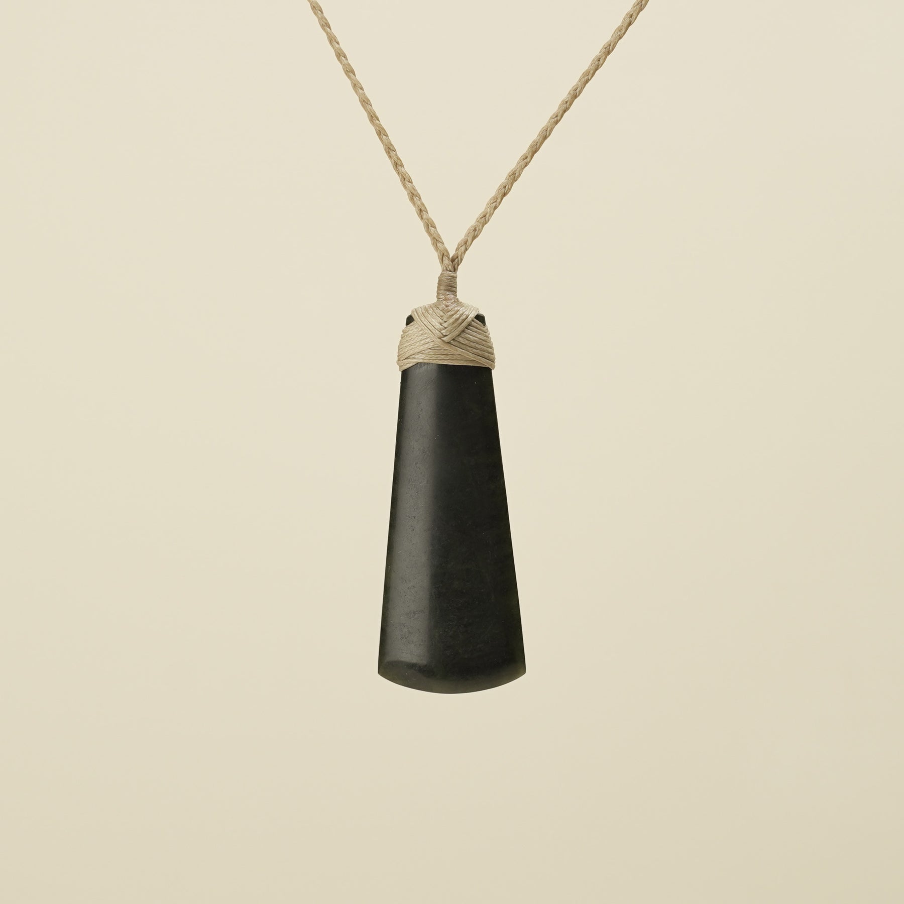Carved in our Arrowtown workshop from rich Kawakawa pounamu, this one-off medium Toki pendant symbolises strength and leadership. Its deep green tones are enhanced by its matte finish, beautifully highlighting the natural beauty of Aotearoa’s pounamu. Paired with an adjustable handwoven tan cord for a personalised fit, this remarkable Toki is elegantly presented in an eco-friendly box, accompanied by cards detailing its meaning and care—a truly cherished taonga.