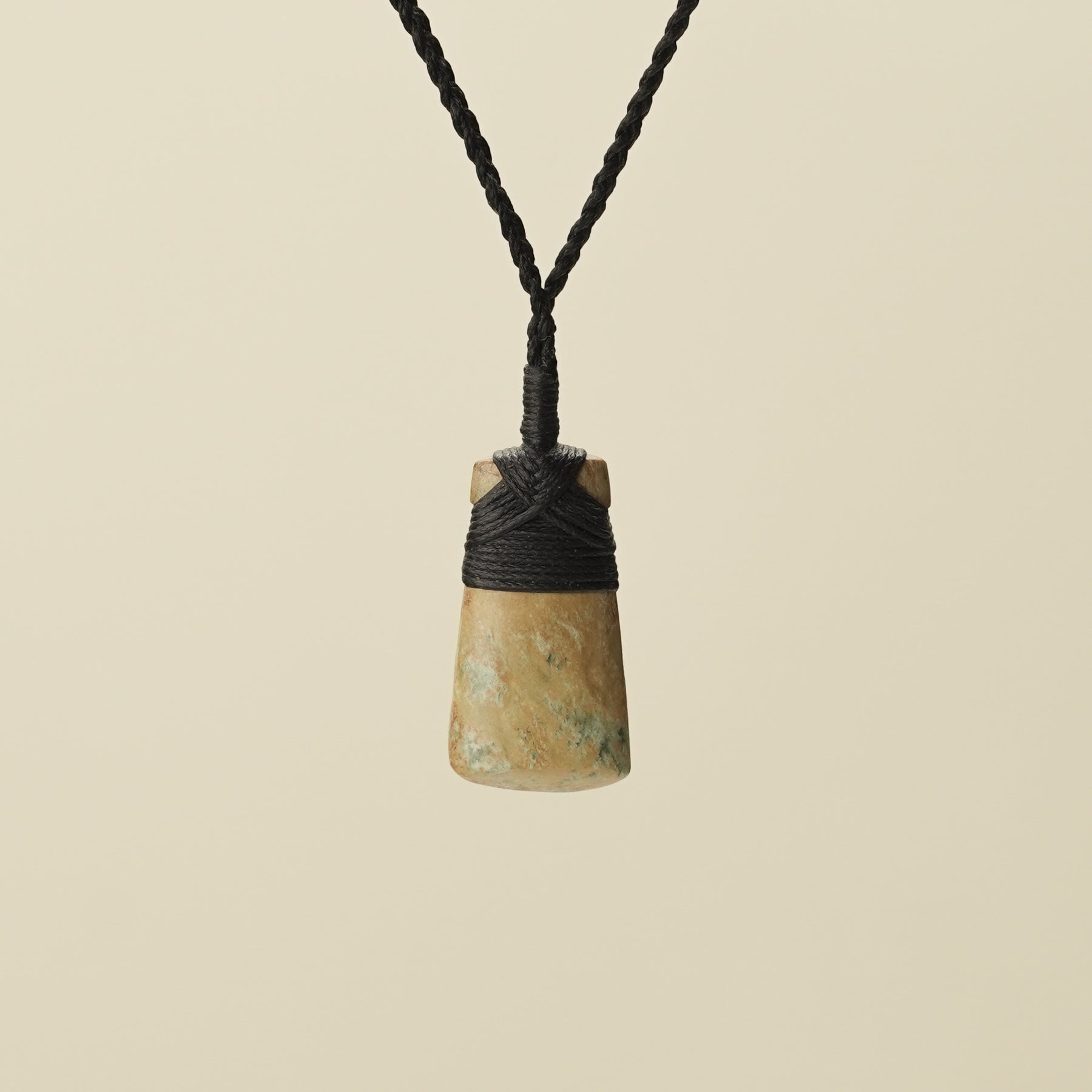 This extra small matte Toki pendant, carved from Raukaraka pounamu, showcases yellow tones woven through green hues, inspired by the native Karaka tree. Symbolising strength, determination, and bravery. Paired with an adjustable black handwoven cord for a personalised fit, the pendant is presented in an eco-friendly box with a Toki meaning and care card.