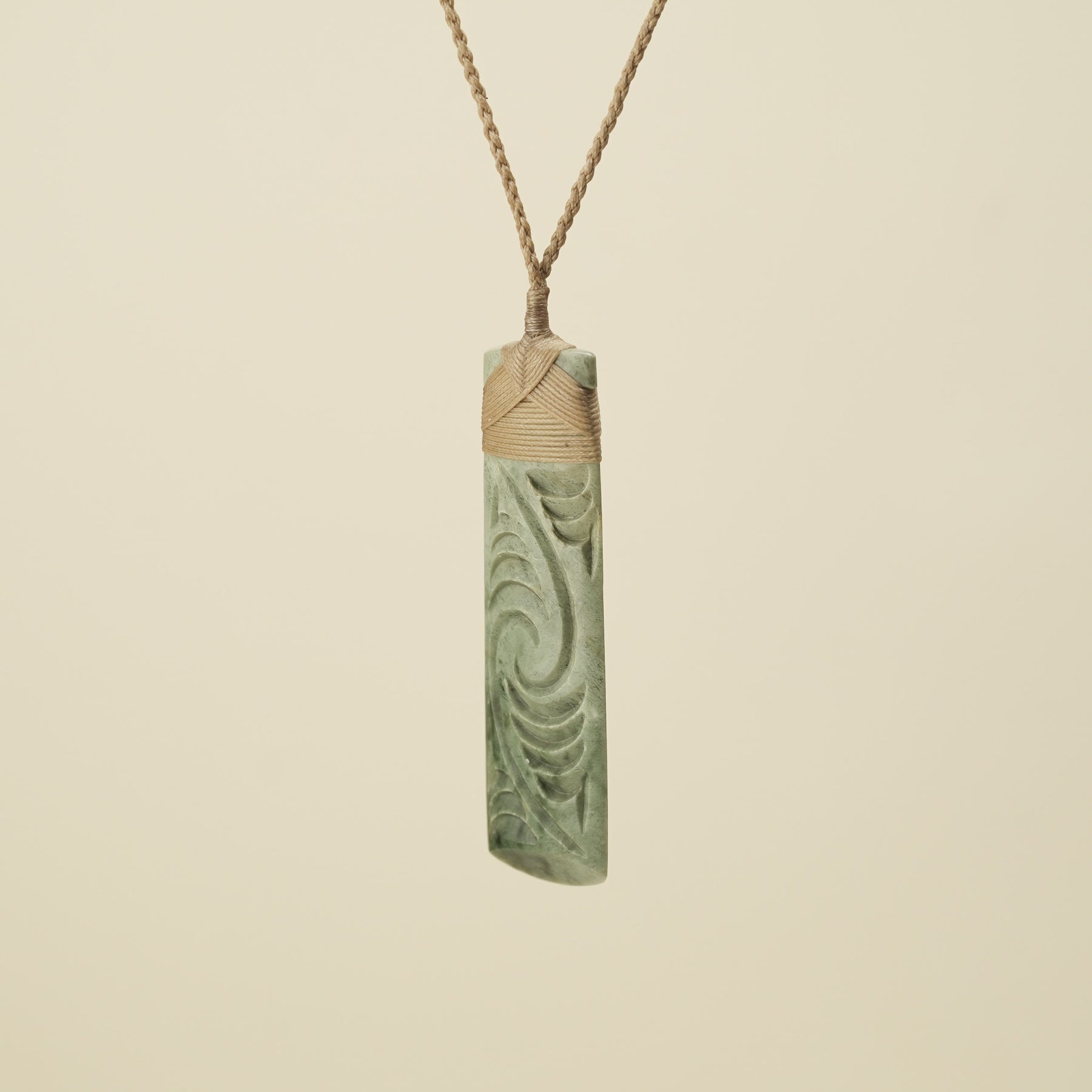 This large Toki pendant symbolises strength, determination, and courage, carrying the mana of its wearer. Handcrafted by Sands Carving Studio from Inanga Pounamu, it features meticulously hand-carved koru-inspired swirls and whakarei detailing that lend depth and cultural significance. Its grey-green, blue and silver tones catch the light like the native inanga fish. Finished with a tan handwoven cord that complements its strong, elegant form, this pendant is presented in an eco-friendly box with a keepsake card explaining its meaning and care.
