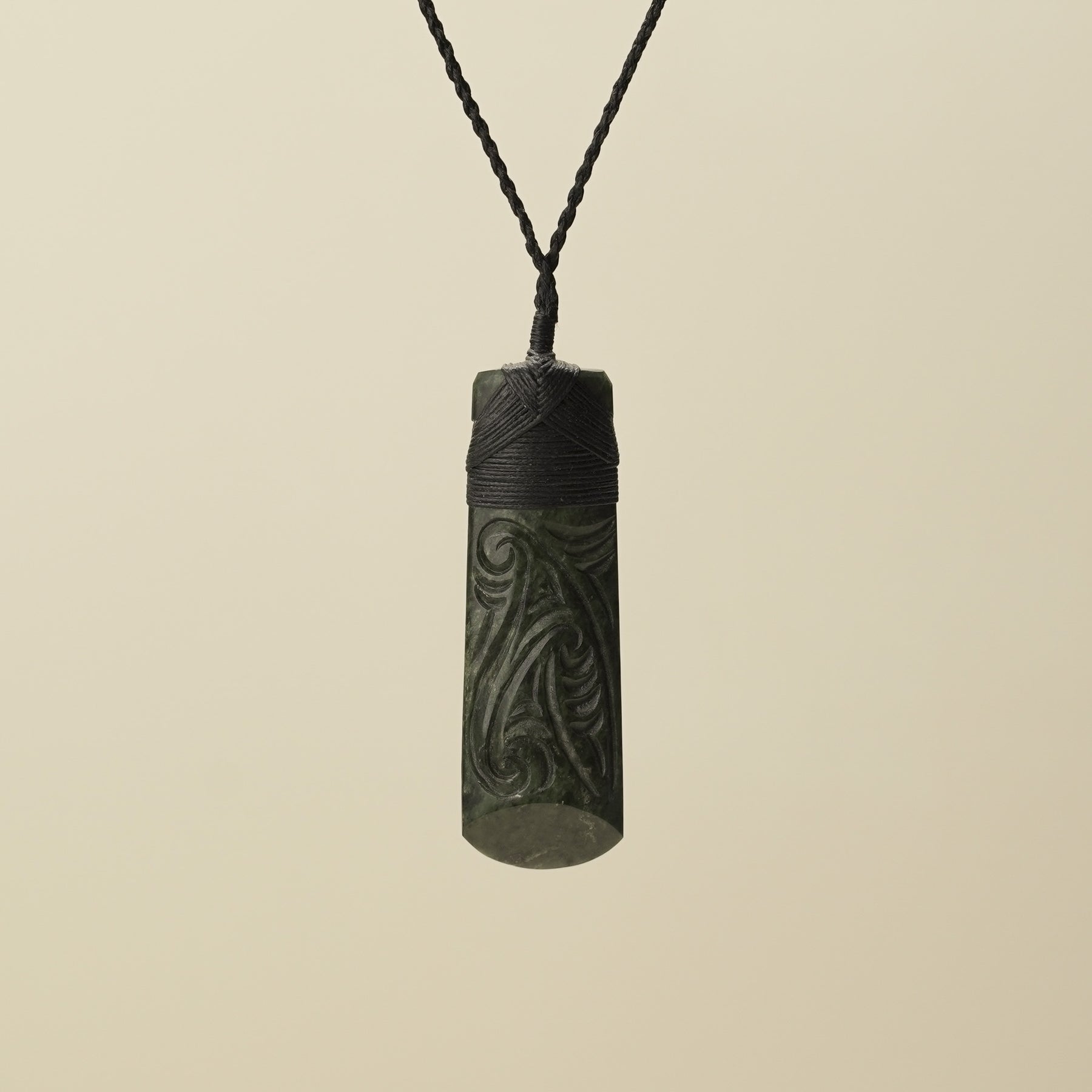 This large Toki pendant symbolises strength, determination, and courage, carrying the mana of its wearer. Handcrafted by Sands Carving Studio from Kawakawa Pounamu, it features meticulously hand-carved koru-inspired swirls and whakarei detailing that lend depth and cultural significance. Its deep green tones, and vibrant green highlights beautifully capture the natural beauty of Aotearoa’s pounamu. Finished with a black handwoven cord that complements its strong, elegant form, this pendant is presented in an eco-friendly box with a keepsake card explaining its meaning and care.