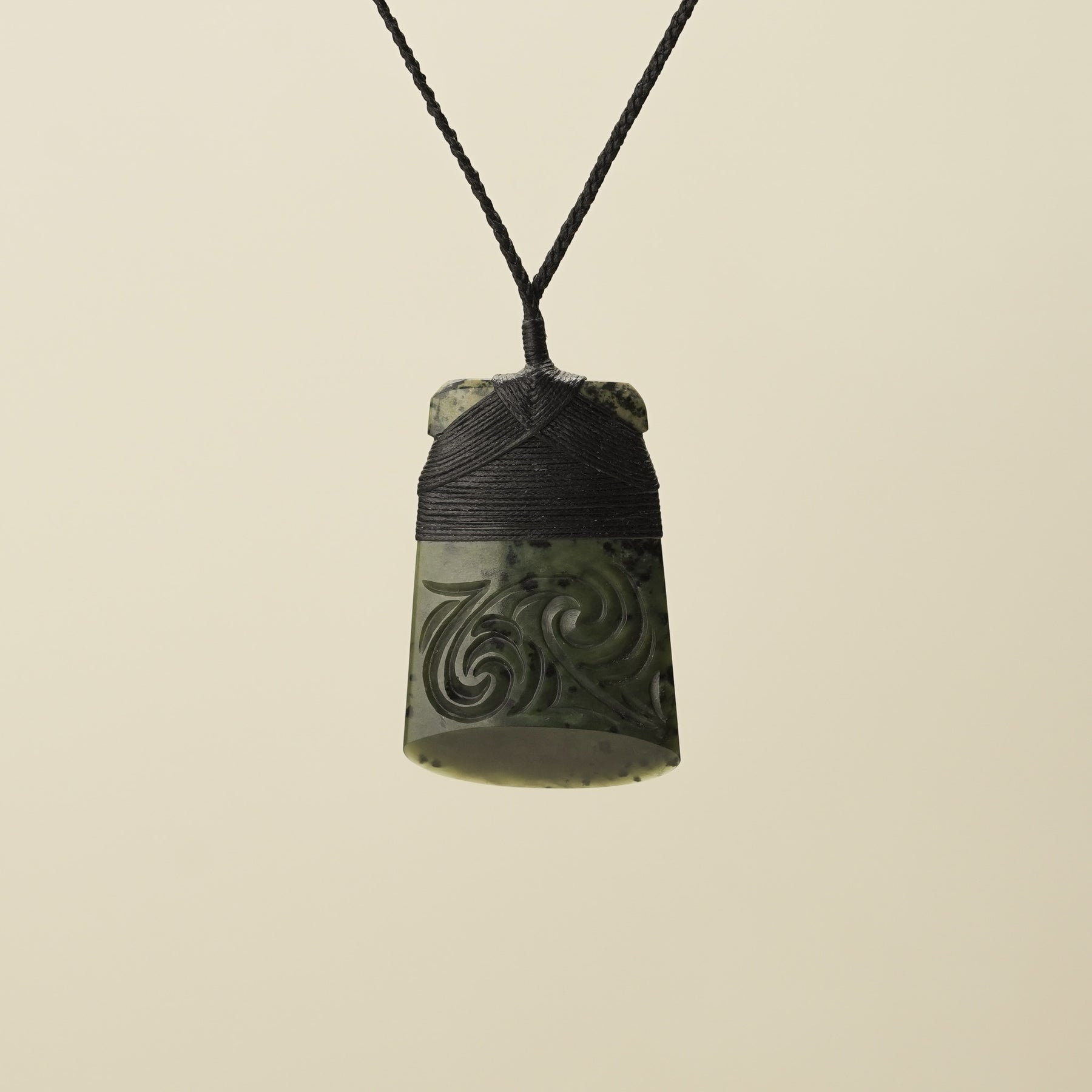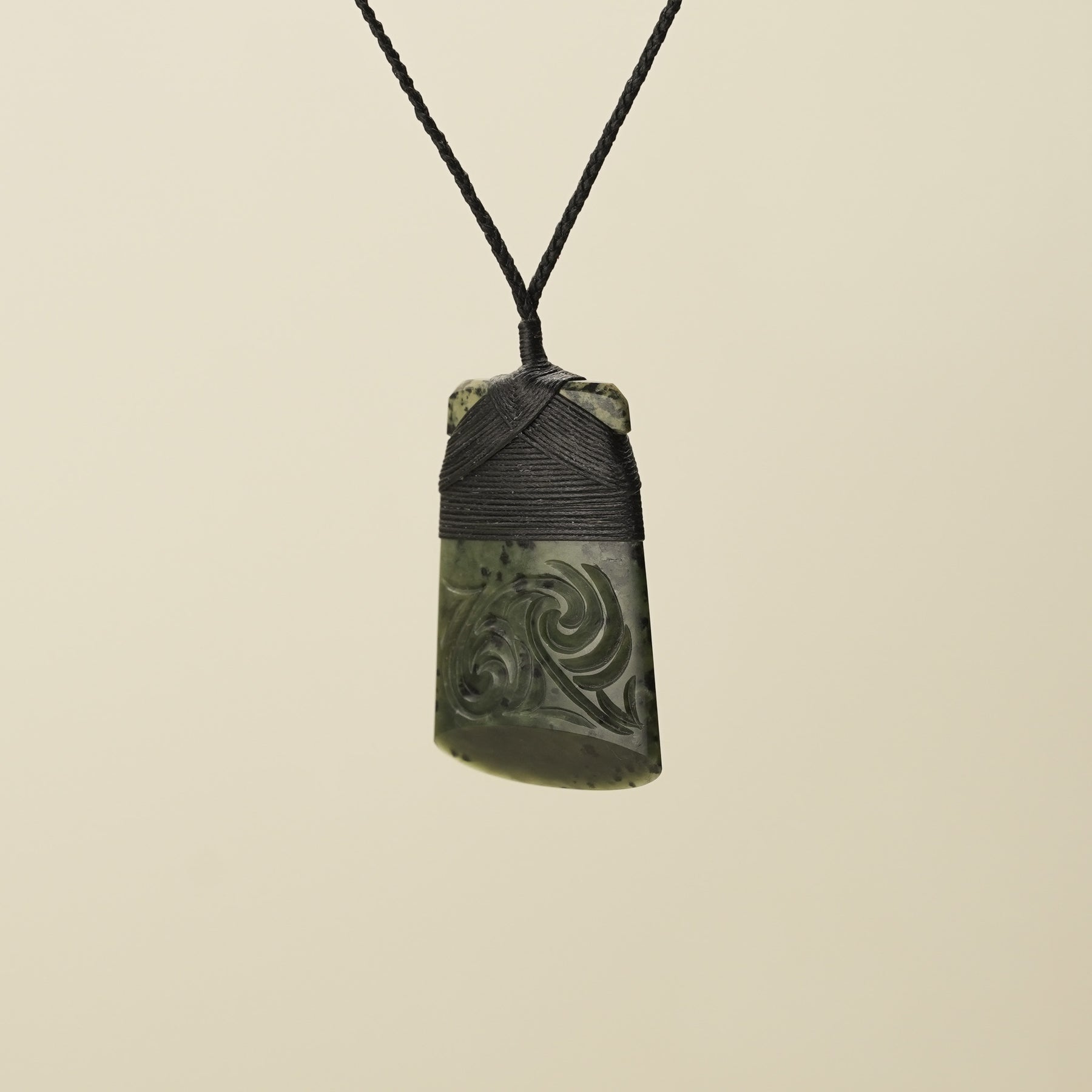 This large Toki pendant symbolises strength, determination, and courage, carrying the mana of its wearer. Handcrafted by Sands Carving Studio from Kōkopu Pounamu, it features meticulously hand-carved koru-inspired swirls and whakarei detailing that lend depth and cultural significance. The pendant features dark green tones, with unique speckles that reflect the beauty of the native Kokopu trout. Finished with a black handwoven cord that complements its strong, elegant form, this pendant is presented in an eco-friendly box with a keepsake card explaining its meaning and care.